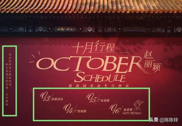 Nhìn lại lịch trình công việc của Triệu Lệ Dĩnh cũng có thể thấy nữ diễn viên mỗi ngày đều bận rộn với công việc, cô gần như không có thời gian để nghỉ ngơi. Ngày 13 tháng 10, cô tham gia hoạt động thương hiệu, ngày 14 và 15 quay quảng cáo, ngày 16 ra nhập đoàn phim, thời gian còn lại thì đều hoạt động trong đoàn phim.