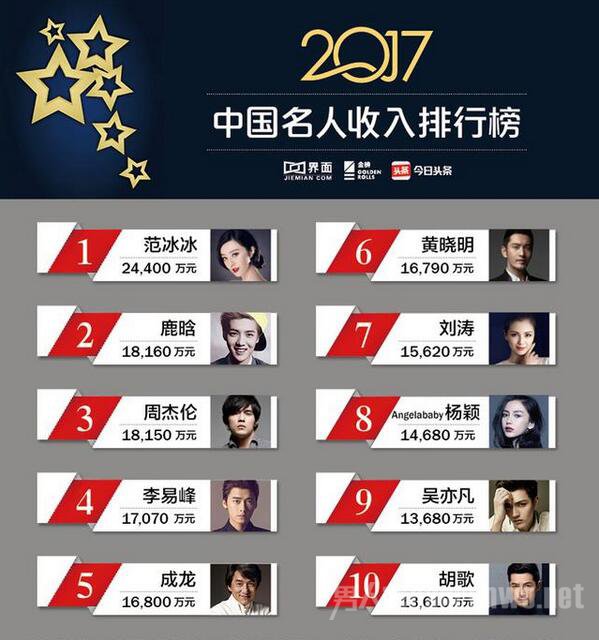 5 năm liên tiếp Phạm Băng Băng đứng đầu trên bảng xếp hạng người nổi tiếng của Forbes Trung Quốc về thu nhập và sự ảnh hưởng trong giới nghệ thuật. Năm 2013, cô kiếm về 110 triệu NDT (380 tỷ đồng). Năm 2014 thu nhập tăng lên thành 122 triệu NDT (421 tỷ đồng). Năm 2015 số tiền cô mang về lại tiếp tục tăng đến 138 triệu NDT (476 tỷ đồng). Đến năm 2016, đạt mốc 240 triệu NDT (829 tỷ đồng), năm tiếp theo trở thành 300 triệu NDT (hơn 1 ngàn tỷ đồng). 5 năm vừa qua (không tính đến năm 2018) mức thu nhập về hoạt động nghệ thuật giúp Phạm Băng Băng bỏ túi đến 900 triệu NDT (3100 tỷ đồng).