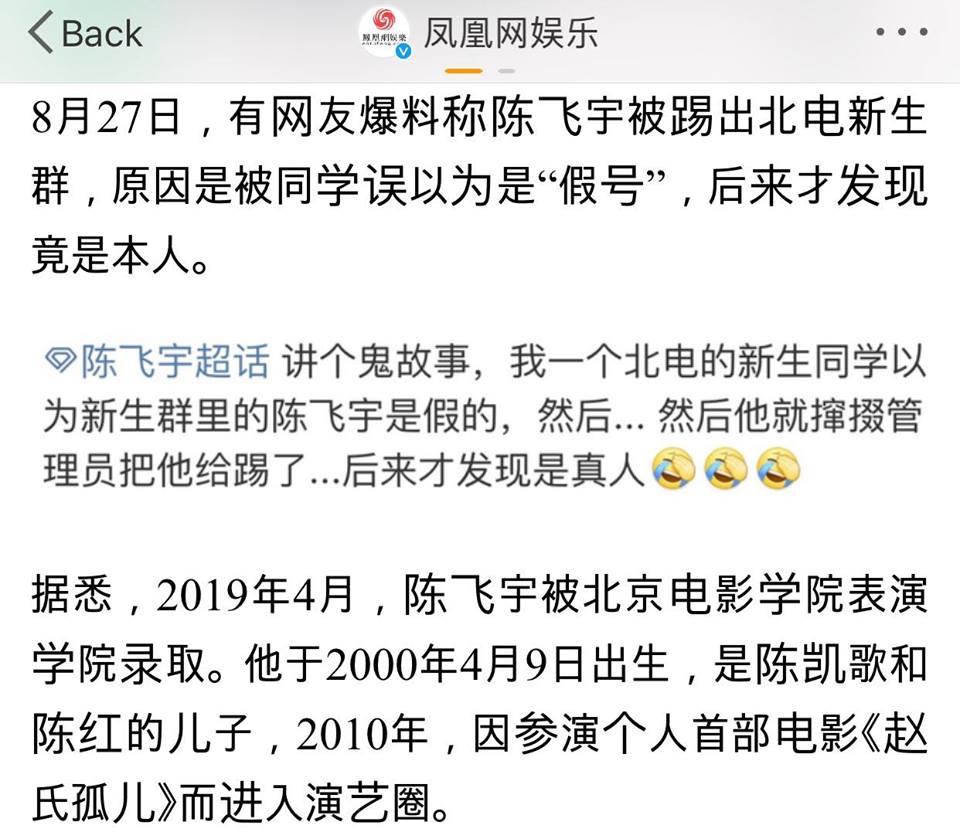 Được biết, vào tháng 4/2019, Trần Phi Vũ được nhận vào Học viện Điện ảnh Bắc Kinh. Trần Phi Vũ sinh ngày 9/4/2000, là con trai của Trần Khải Ca và Trần Hồng; năm 2010, vì tham gia vào bộ phim điện ảnh đầu tiên tên Triệu thị cô nhi đã bước vào giới giải trí. Theo dân mạng tiết lộ Trần Phi Vũ bị đá khỏi nhóm này vì bị nghi ngờ rằng đây là tài khoản giả mạo anh chàng họ Trần nên bị các thành viên trong nhóm yêu cầu quản trị viên đá tài khoản này ra để tạo môi trường trong lành. Sau khi bị đá ra khỏi nhóm thì mọi người mới biết đây là tài khoản thật.