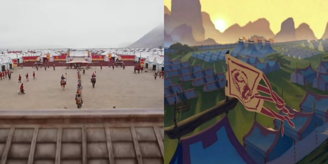 Lều trại quân đội của bản cũ nhìn khá nhiều và sống động, trong khi phiên bản của Disney lại có vẻ đơn điệu, thưa thớt. Xa xa, xuất hiện rất nhiều dãy núi trong khung hoạt hình, còn bản live-action thì chỉ lấp ló chút xíu.
