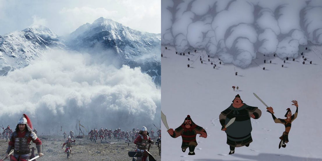 Cảnh tuyết lở là một phần tuyệt vời khác từ Mulan bản gốc, vì vậy thật tốt khi thấy rằng nó cũng được đưa vào Mulan live-action. Trận tuyết lở xảy ra khi người Hun tấn công và Mulan sử dụng một khẩu súng thần công để nhốt chúng trong tuyết, đó là dấu hiệu cho thấy cô thông minh cũng như có kỹ năng chiến đấu. Dường như đây là một trong những cảnh sẽ được chuyển thể rất trung thực từ bộ phim hoạt hình.