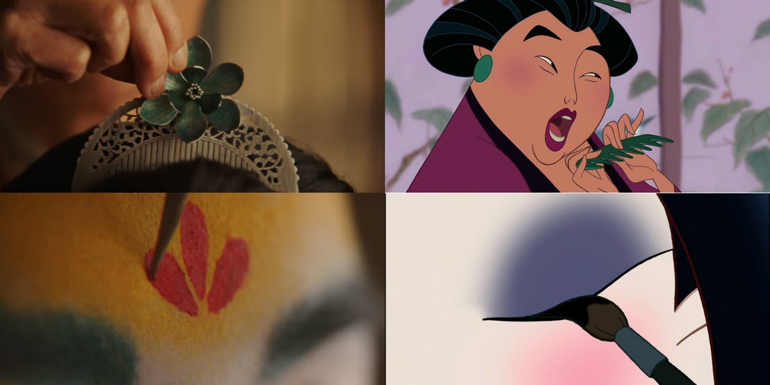Bản làm lại Mulan của Disney gây tranh cãi không phải là một vở nhạc kịch, điều đó có nghĩa là không có bài hát kinh điển nào được thể hiện trong trailer. Tuy nhiên, khán giả cũng được nghe Mulan nói rằng cô ấy sẽ “mang lại danh dự cho tất cả chúng ta” , dẫn đến chuỗi phong cách trang điểm gây ấn tượng mạnh mẽ của cảnh “Honor To Us All” từ bản gốc. Chú ý chiếc lược màu xanh lá cây xuất hiện thoáng qua, đó là chi tiết liên hệ thú vị giữa 2 bản phim.