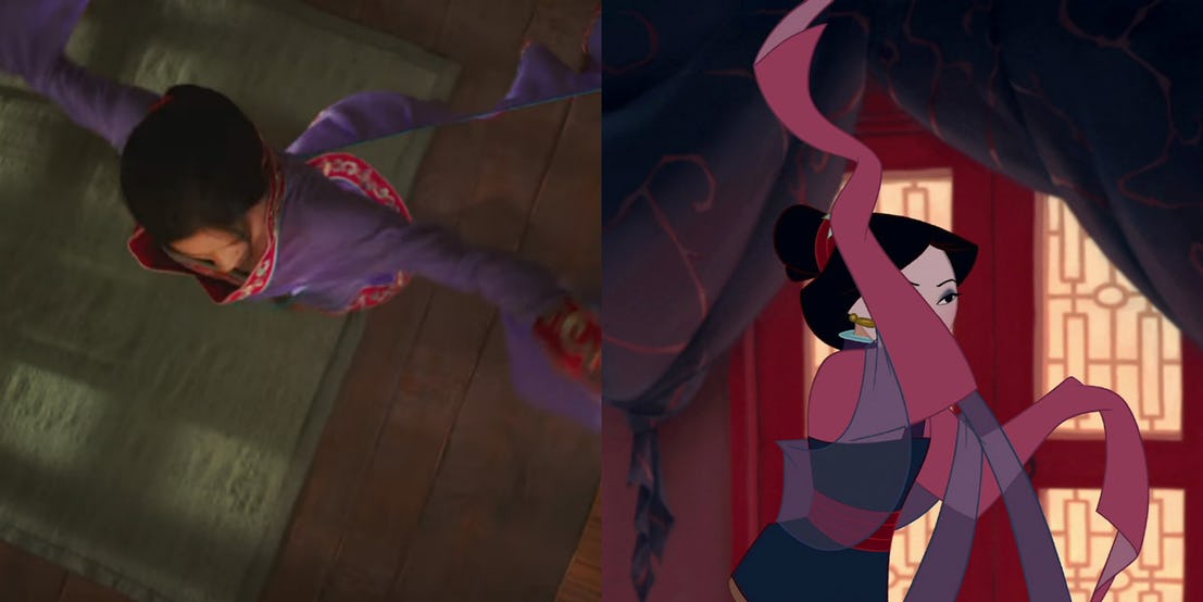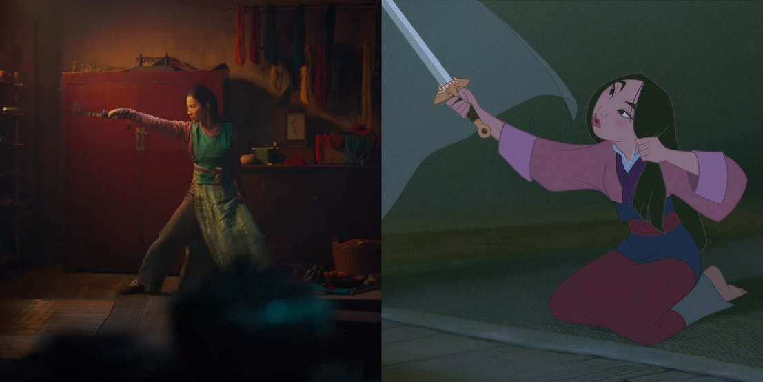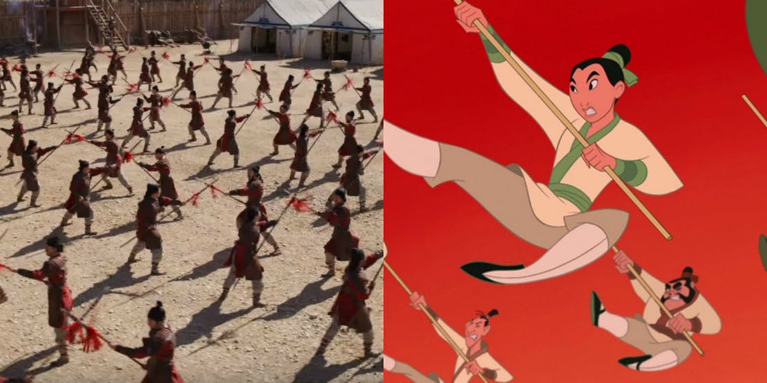 Phiên bản làm lại của Mulan có vẻ sẽ đem đến một chiến binh Mulan mạnh mẽ hơn rất nhiều so với bản gốc. Trong cả hai cảnh này, chúng ta đều thấy Mulan sử dụng thanh kiếm của cha mình, nhưng trong đoạn trailer Mulan live-action, cô ấy có vẻ giỏi sử dụng vũ khí, trái ngược với sự không chắc chắn hơn trong bản gốc.