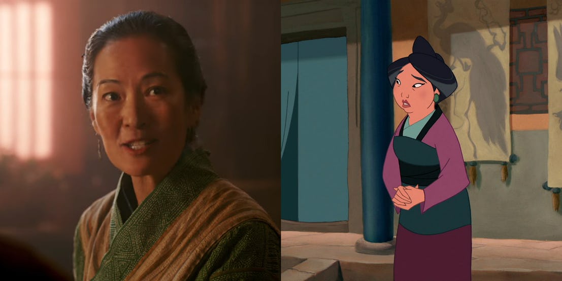 Khán giả được gặp gia đình của Mulan trong đoạn trailer cho bản Mulan live-action, bắt đầu với mẹ cô, Hua Li (Rosalind Chou), người được Freda Foh Shen lồng tiếng trong bản gốc. Một lần nữa, chúng ta có thể thấy rằng nhà sản xuất đã chú ý nhiều hơn đến việc chỉn chu trang phục ở đây, với màu xanh lá cây và vàng trông truyền thống và chi tiết hơn những gì chúng ta thấy trong phim hoạt hình Mulan.