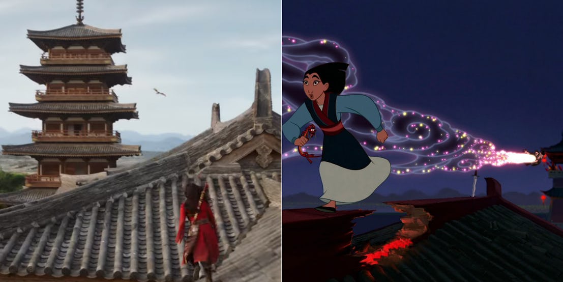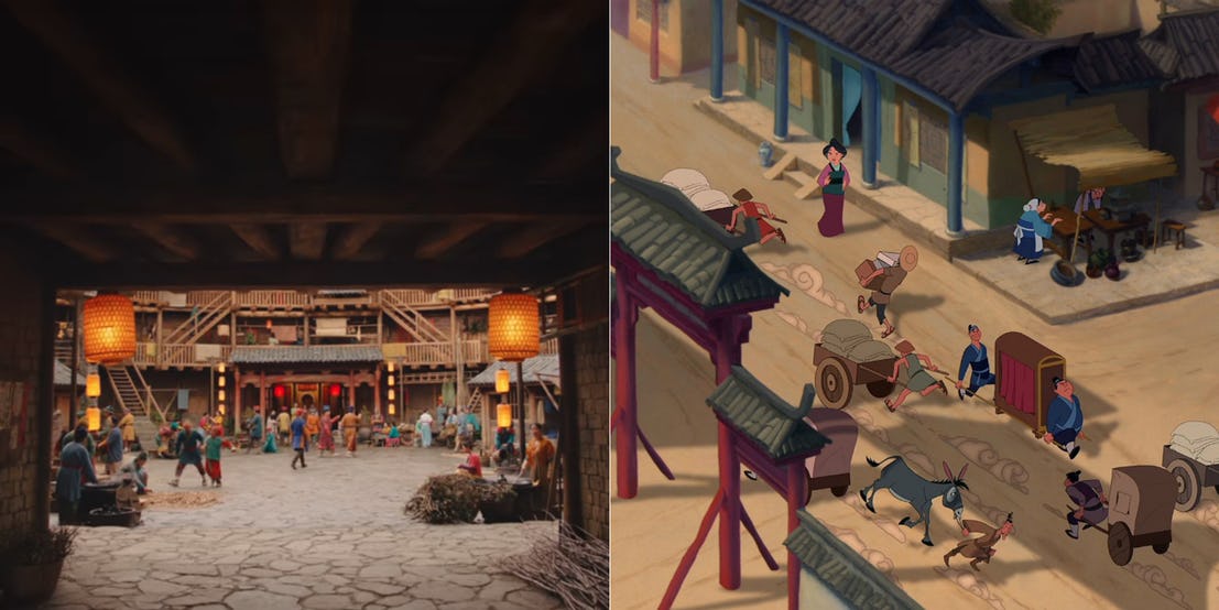 Bám sát vào điều đó, chúng ta có thể thấy cảnh quay này về quê nhà của Mulan trong đoạn trailer Mulan live-action trông rất chi tiết thậm chí khi nhìn từ xa. Có một số vệt màu dọc theo các tòa nhà bằng gỗ, và có vẻ như họ đã nắm lấy cơ hội này để thể hiện một bản nhạc jazz làm nền. Trong Mulan bản hoạt hình, mặc dù không khác biệt nhiều nhưng các thiết kế có vẻ đơn giản hơn.