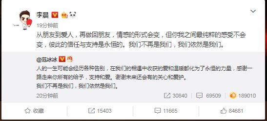 Lý Thần nhanh chóng shares lại bài viết của Phạm Băng Băng: “Từ bạn bè đến người yêu, lại về làm bạn bè, hình thức tình cảm sẽ thay đổi, nhưng tình cảm thuần túy giữa chúng ta sẽ không thay đổi, luôn ủng hộ và tin tưởng là mãi mãi. Chúng ta không còn là chúng ta nữa, chúng ta vẫn là chúng ta của như xưa”.