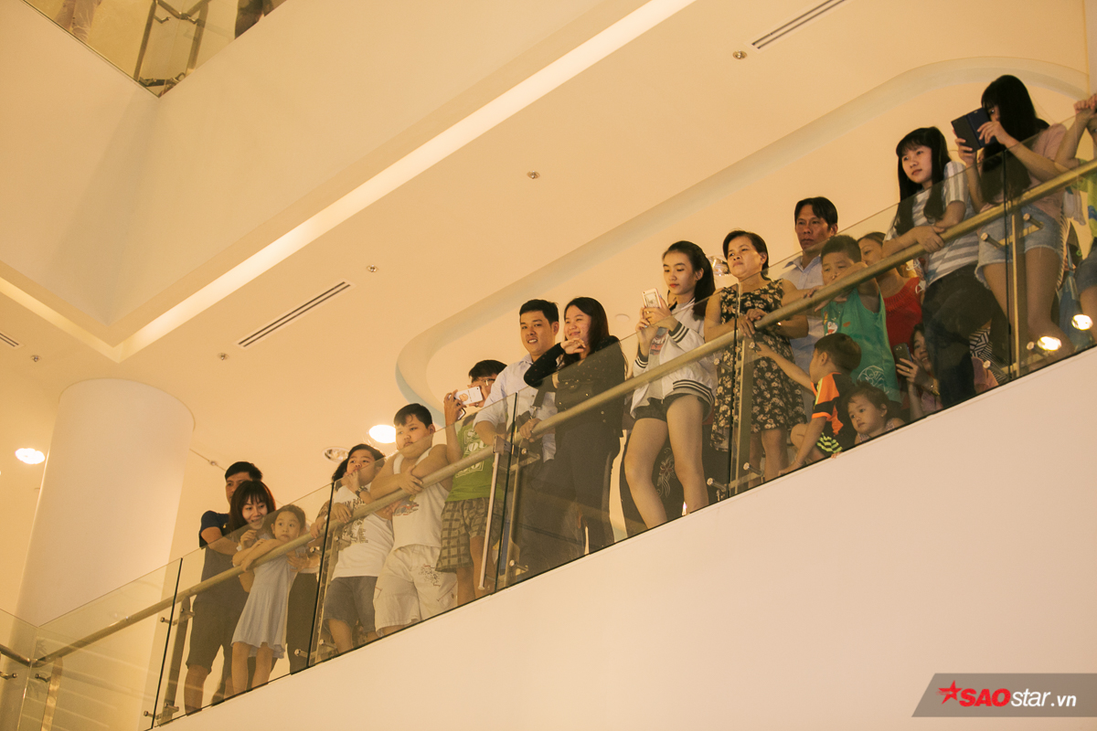 Không chỉ dưới sân khấu, khán giả còn đứng cả trên các tầng lầu để nhìn ngắm và lắng nghe Sơn Tùng hát.