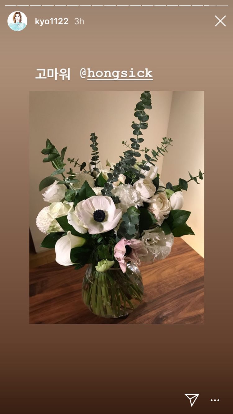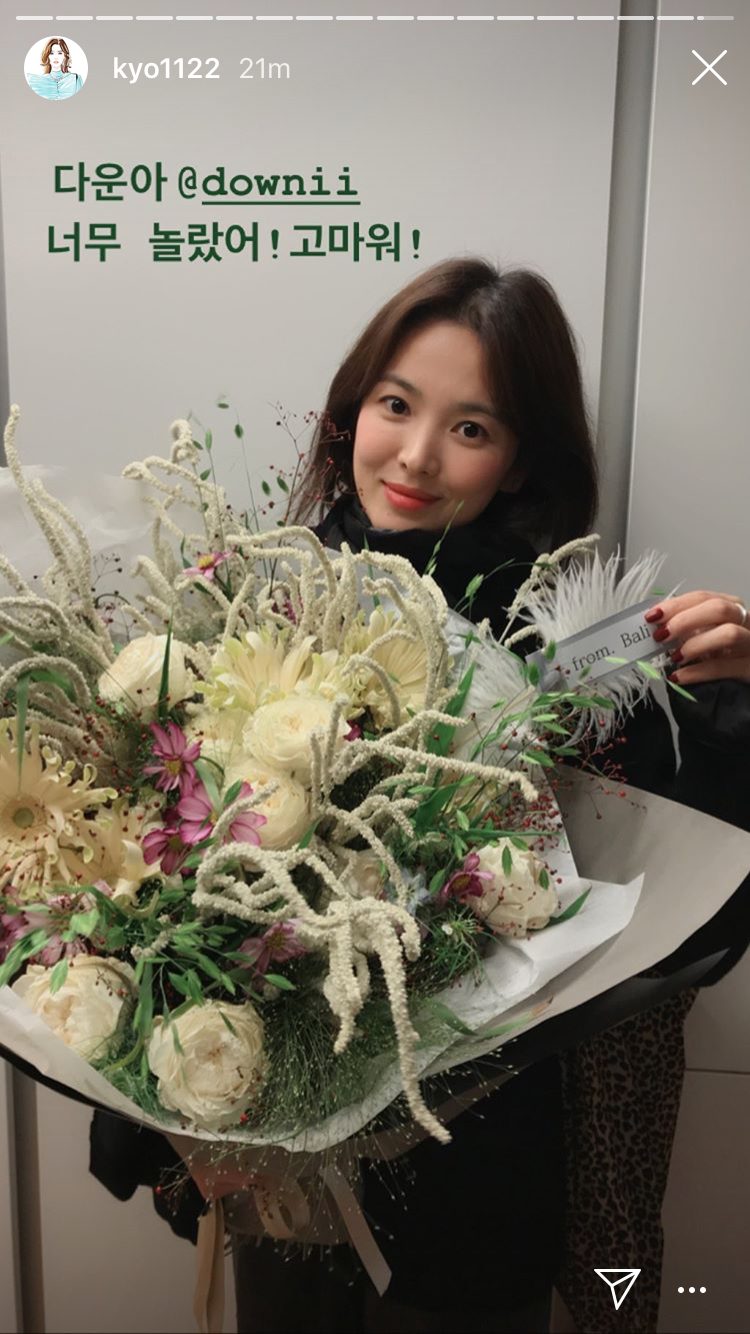 Trong những bức ảnh công khai, Song Hye Kyo khoe vẻ ngoài giản dị, trẻ trung và xinh xắn với bó hoa xinh xắn. Yoo Ah In nở nụ cười đáng yêu và dựa sát đầu vào người Song Hye Kyo để thể hiện sự thân thiết, tình bạn ngọt ngào, gần gũi giữa hai chị em. Trước đó, nữ ngôi sao đã chia sẻ lẵng hoa do Yoo Ah In tặng lên trên yourstory của mình với lời nhắn: “Cảm ơn nha”.