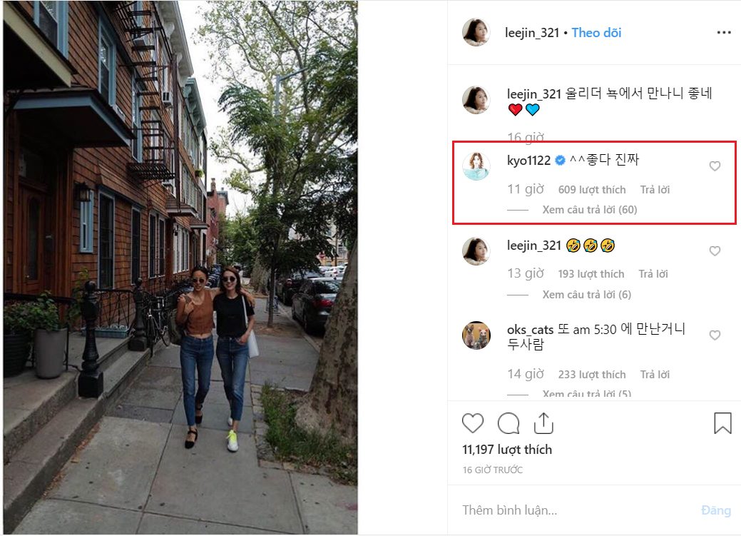 Trong bức ảnh được đăng tải, Lee Jin và Lee Hyori đang tung tăng dạo phố New York. Được biết, Lee Jin hiện đang cư trú tại đây sau khi kết hôn. Nữ ca sĩ cập nhật ảnh chụp với nội dung: “Thật tuyệt vời để gặp gỡ nhà trưởng nhóm của chúng tôi ở New York”.