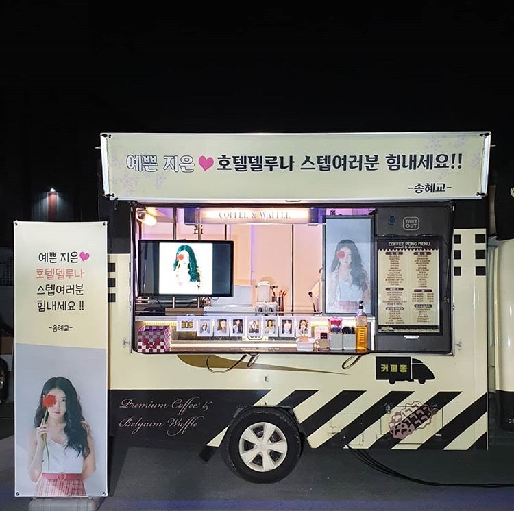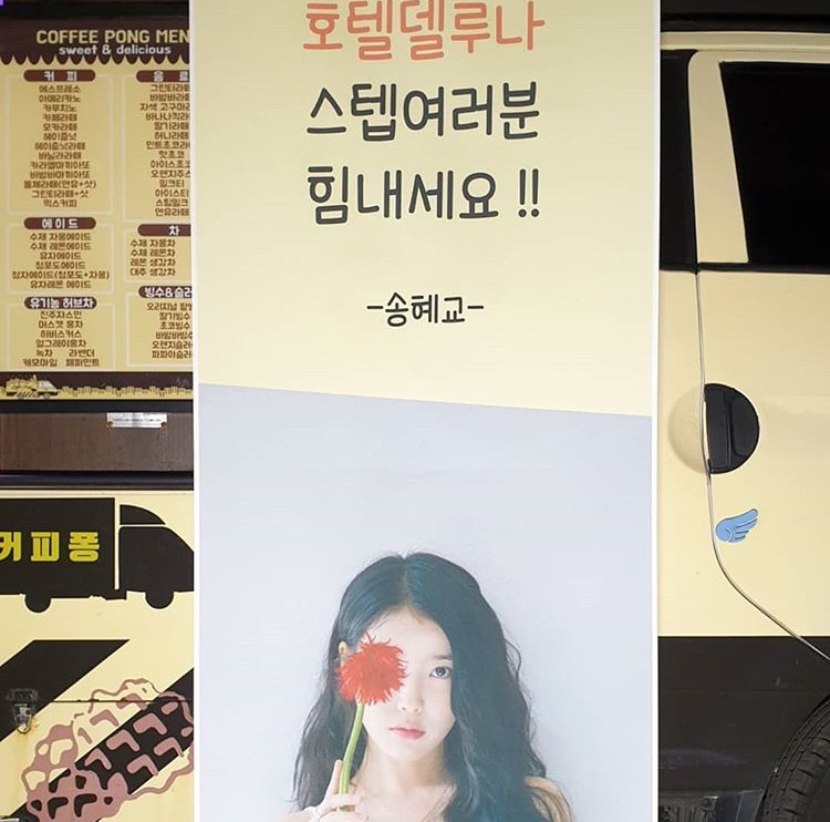 Vào sáng ngày 04/06, Coffee Pong đã đăng những bức ảnh về một chiếc xe tải thực phẩm. Được biết, Song Hye Kyo gửi đến phim trường của dự án phim truyền hình sắp tới Hotel del Luna đài tvN. Bài viết này chia sẻ: “Nữ thần Song Hye Kyo luôn chăm sóc mọi người xung quanh, đã chuẩn cà phê thơm ngon kèm đồ uống và patbingsu (đá bào với đậu đỏ) cho IU cùng các diễn viên, nhân viên đoàn làm phim - những người đang làm việc chăm chỉ đến tận đêm khuya”.