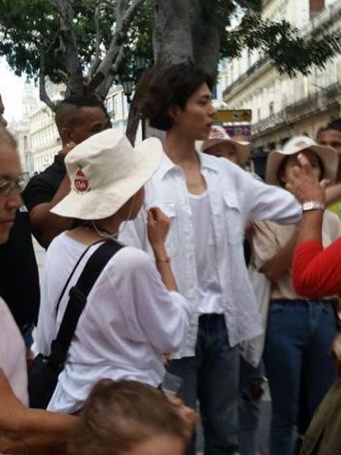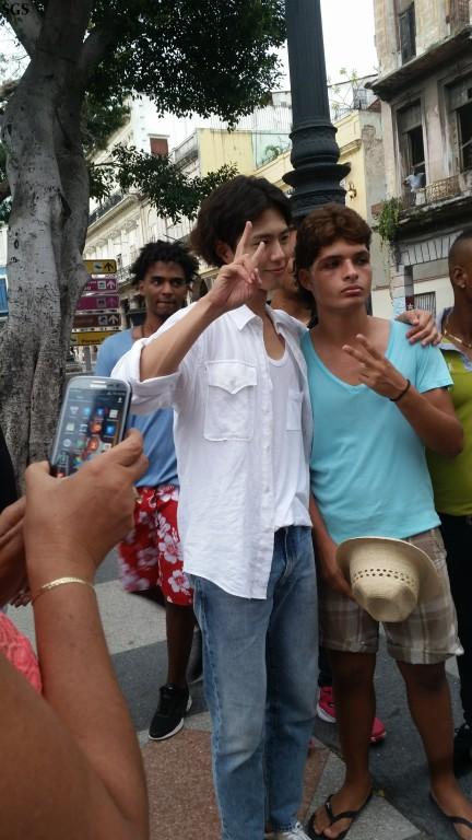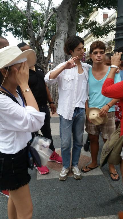 Park Bo Gum nở nụ cười thân thiện, vui vẻ tạo dáng trên đường phố Cuba cùng fan với mái tóc lòa xòa, thiếu chỉn chu so với hình ảnh điển trai thường thấy.