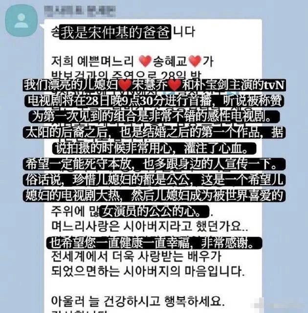 Sau khi có cư dân mạng tìm ra được một tin nhắn của ba Song Joong Ki thì chúng cũng nhanh chóng phát tán trên mạng. Trong tin nhắn biểu thị, trong lúc phim Gặp gỡ do Song Hye Kyo đảm nhận vai chính phát sóng thì ba Song Joong Ki gởi tin nhắn mời bạn bè cùng nhau xem phim này.