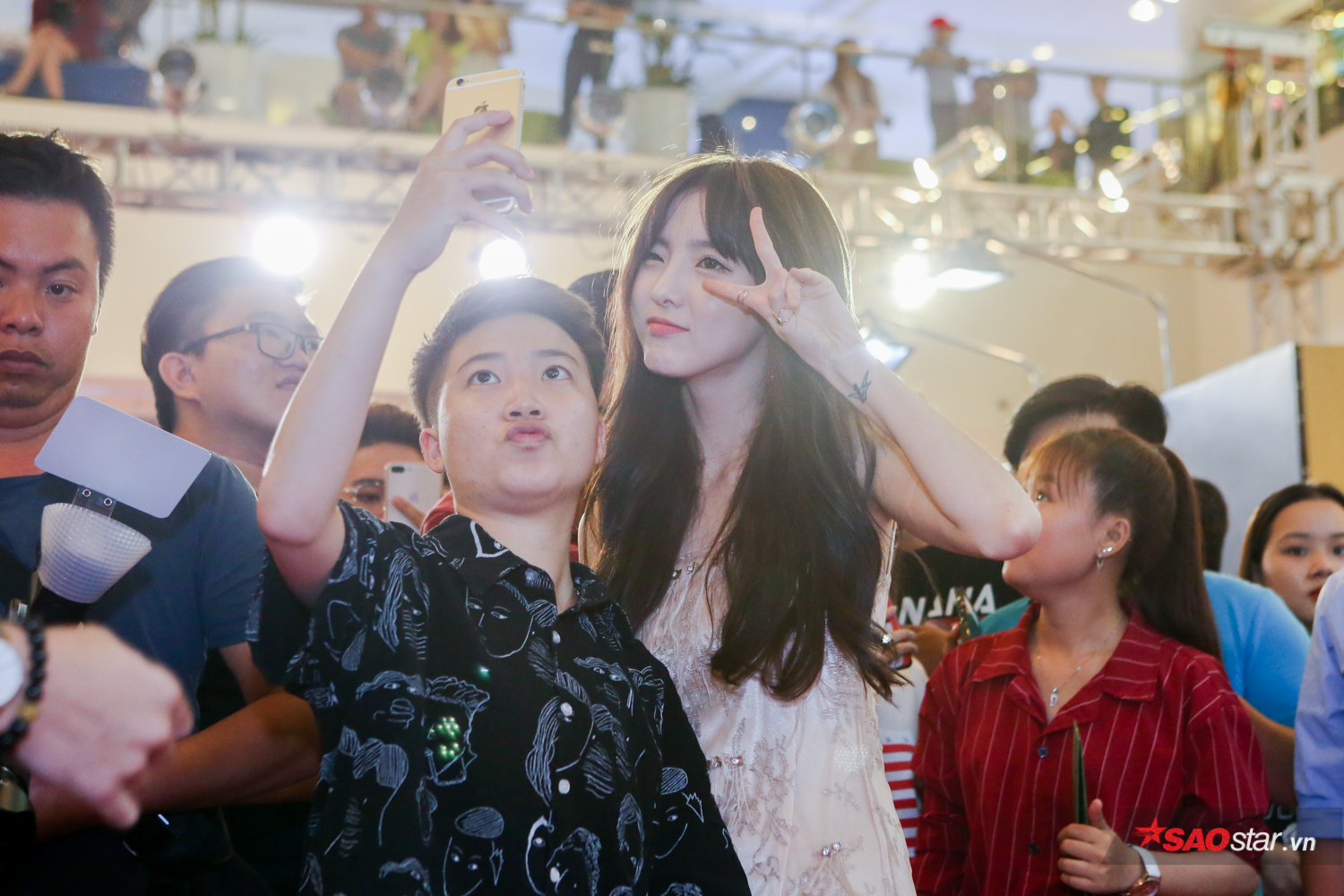 Nene thân thiện chụp hình cùng fan trong họp báo.