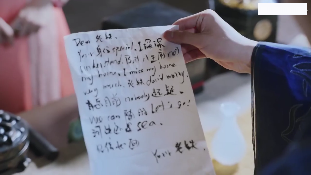 Tiểu Đàn nghĩ ra cách viết thư xen giữa tiếng Trung và tiếng Anh vô cùng hài hước như ký hiệu vì nghĩ Mặc Dịch Hoài cũng từ hiện đại xuyên không về giống mình.