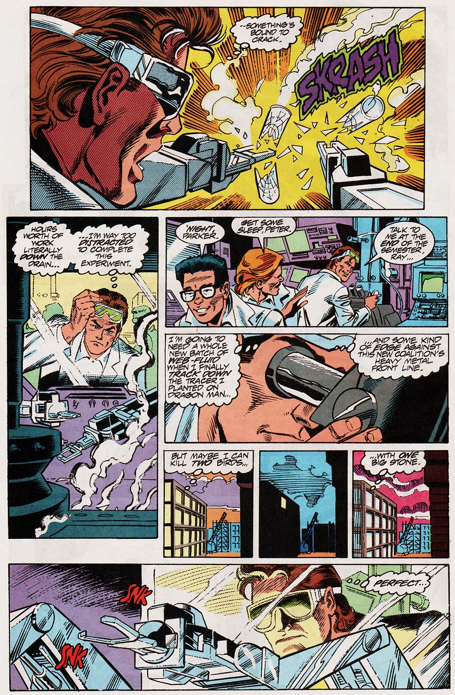 Lần đầu tiên anh mặc bộ Spider-Armor là trong Web Of Spider Man (1985) # 100. Khi chiến đấu với một nhóm được gọi là New Enforcers, do bị áp đảo nên Spidey quyết định anh cần một bộ đồ mạnh hơn để làm chệch hướng và chống sát thương. Trong một phòng thí nghiệm tại Đại học Empire, anh đã tạo ra một bộ giáp có chất liệu là 1 hợp chất giả kim loại giống như thép.