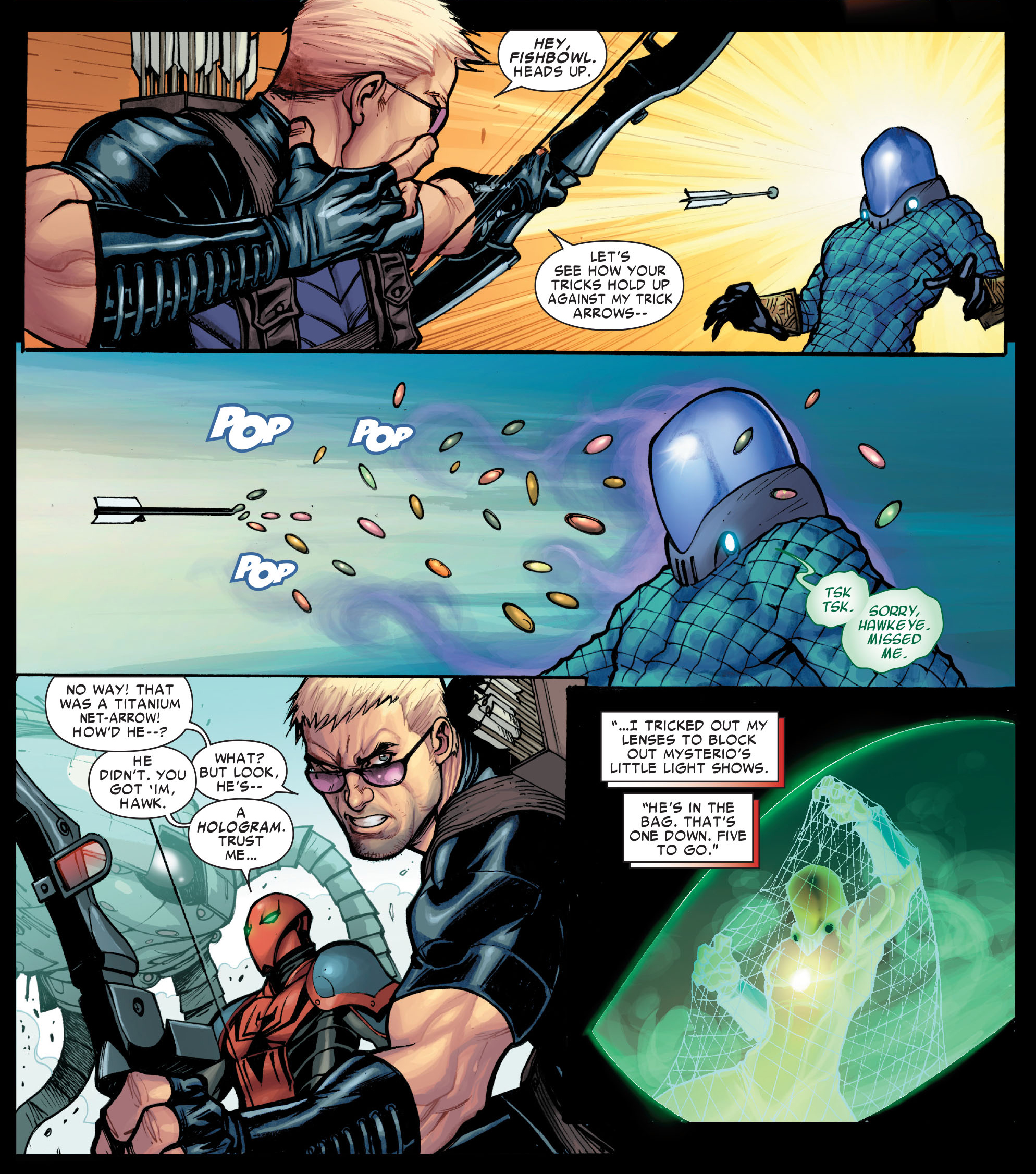 - Holographic Visor: Ống kính đặc biệt được thiết kế để nhìn xuyên thấu ảo giác và ảnh hologram của Mysterio.