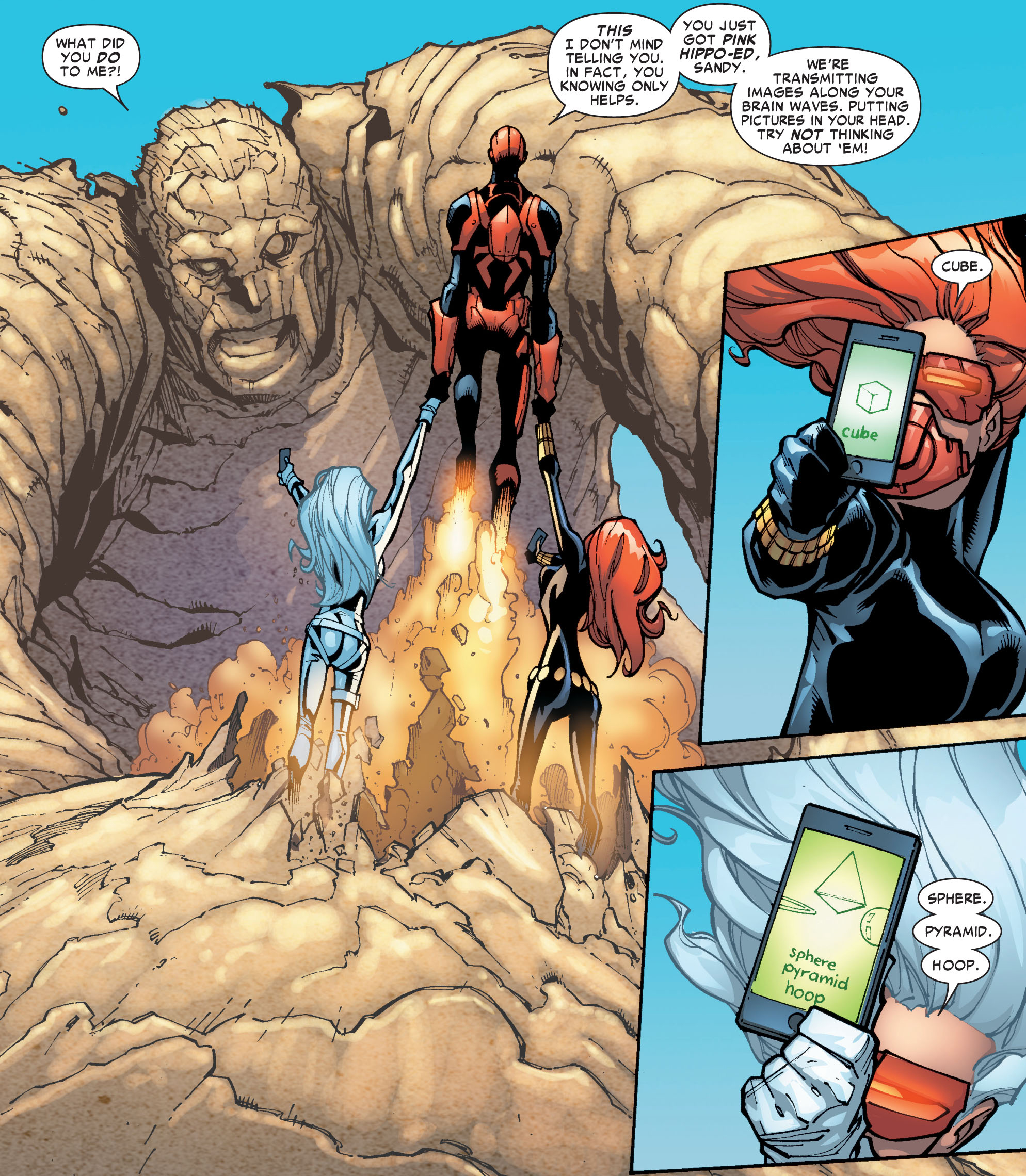 - Pink Hippo App: Sau khi phun 1 loại dung dịch phóng xạ đặc biệt lên Sandman, Spidey kích hoạt ống kính thị lực để có thể tìm ra 1 hạt cát đặc biệt trong cơ thể của Marko. Hạt cát này hoạt động như một con ong chúa, có vai trò gửi thông tin tới các hạt khác để hành động. Sau khi kết nối nó với bộ đồ của mình, Spidey sử dụng smartphone truyền lệnh, thay đổi hình thức cơ thể của Marko tùy ý khác với ý muốn của hắn ta. Nói cách khác, Spidey có thể khiến cơ thể Sandman biến thành hình vuông hay bất kì hình thù gì nếu muốn.