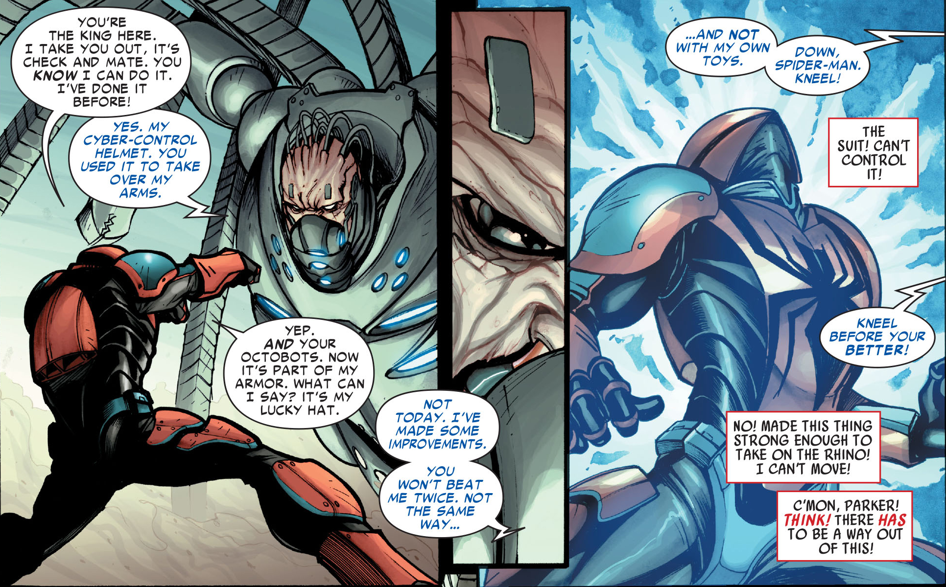 - Cyber-Control Helmet: Dựa trên chiếc mũ ban đầu của Doc Ock, có tính năng điều khiển được mọi loại máy móc trong thành phố New York. Trong Amazing Spider-Man (1963) # 683, Spidey định dùng tính năng này để vô hiệu hóa công nghệ của Doc Ock, nhưng lão đã chuẩn bị trước và lật kèo, tắt bộ giáp MK III của anh.