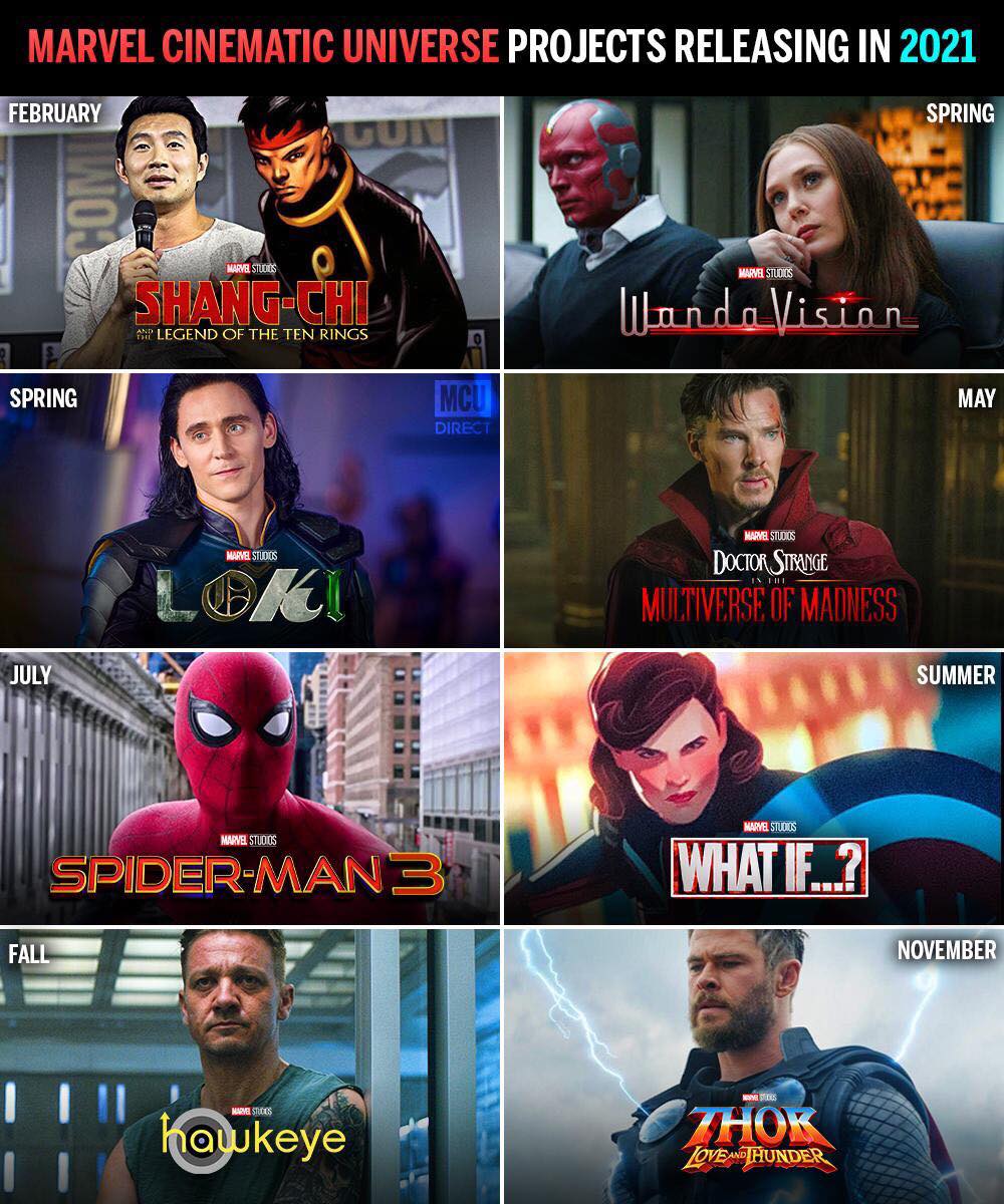 2021 có thể là một năm có nhiều bộ phim của Marvel ra mắt nhất (tính đến thời điểm hiện tại). Cụ thể hơn, có tới 4 bộ phim ra mắt tại rạp và 4 bộ phim trên hệ thống xem phim trực tuyến của Disney - Disney Plus.