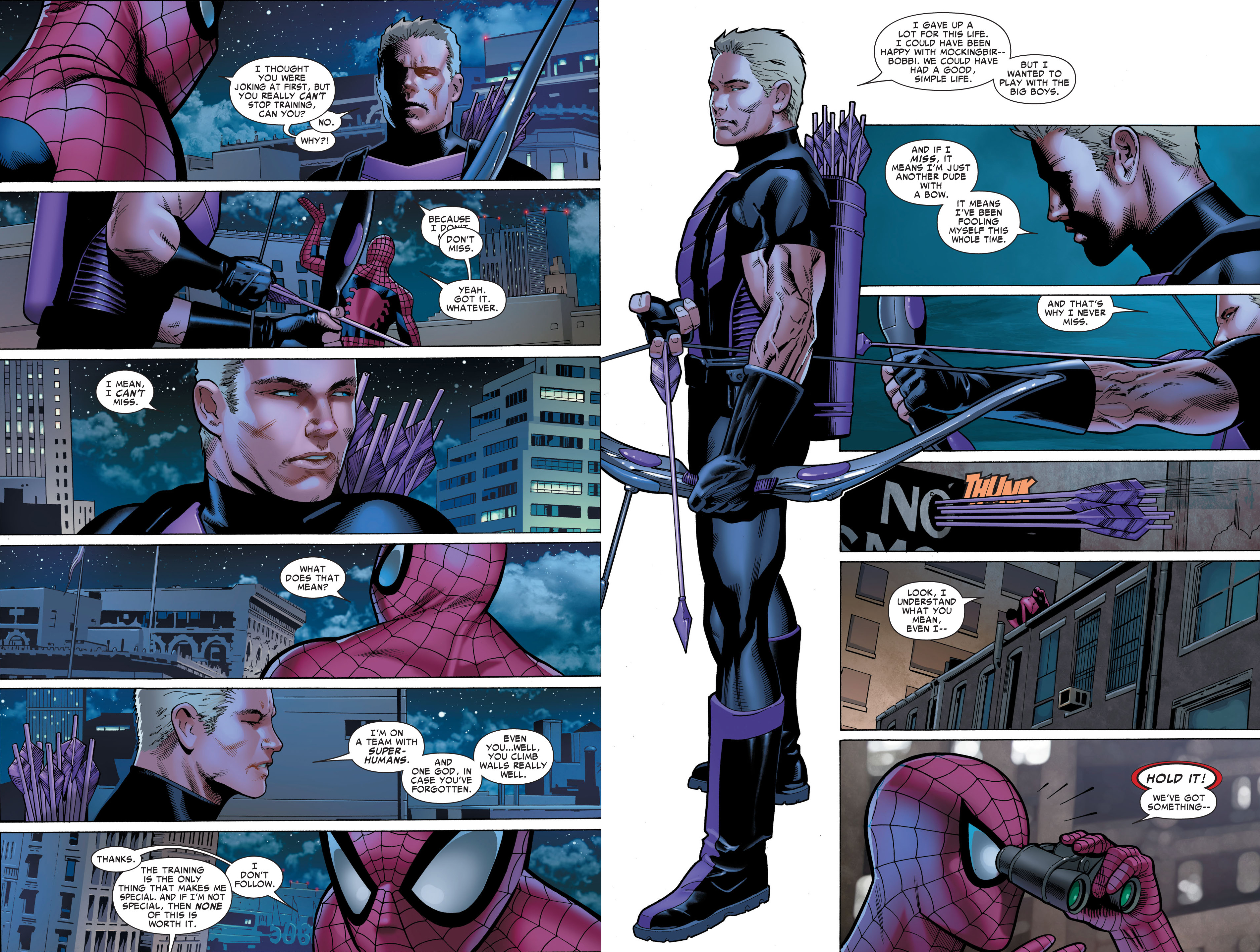 Trong lúc làm nhiệm vụ đi tuần, Clint có bộc bạch về điều này với Spidey. “Bởi vì tôi không được bắn trượt. Ý tôi là, tôi không thể bắn trượt được. Tôi ở trong 1 đội với toàn siêu nhân và 1 vị thần. Trong trường hợp cậu quên thì, ờm, cậu trèo tường rất giỏi. Việc luyện tập là điều duy nhất khiến tôi trở nên đặc biệt. Và nếu tôi không đặc biệt, thì tui chẳng còn giá trị nào cả.