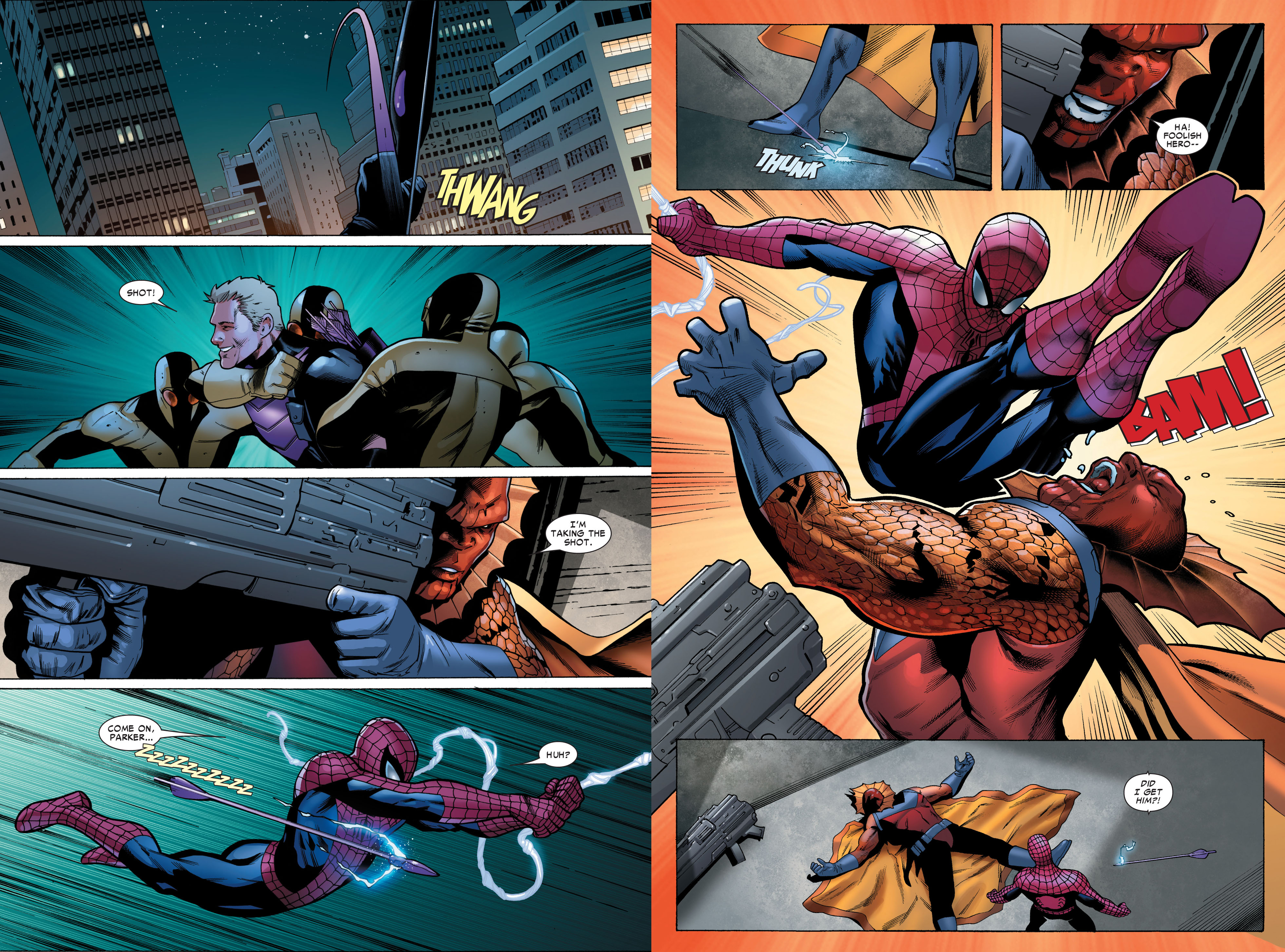 Và Spidey cũng vậy luôn. Ngay sau phát bắn trượt đó, Clint từ xa đã sốt sắng hỏi Spidey xem anh có bắn trúng địch hay không. Thương tình, Spidey bèn nhặt mũi tên dưới đất rồi… cắm thẳng vào người Side-Winder. Khi Clint phóng xe tới, những gì anh thấy chỉ là 1 tên tội phạm đã gục trước mũi tên của anh mà thôi. Và rồi anh đã vỡ òa trong sung sướng.
