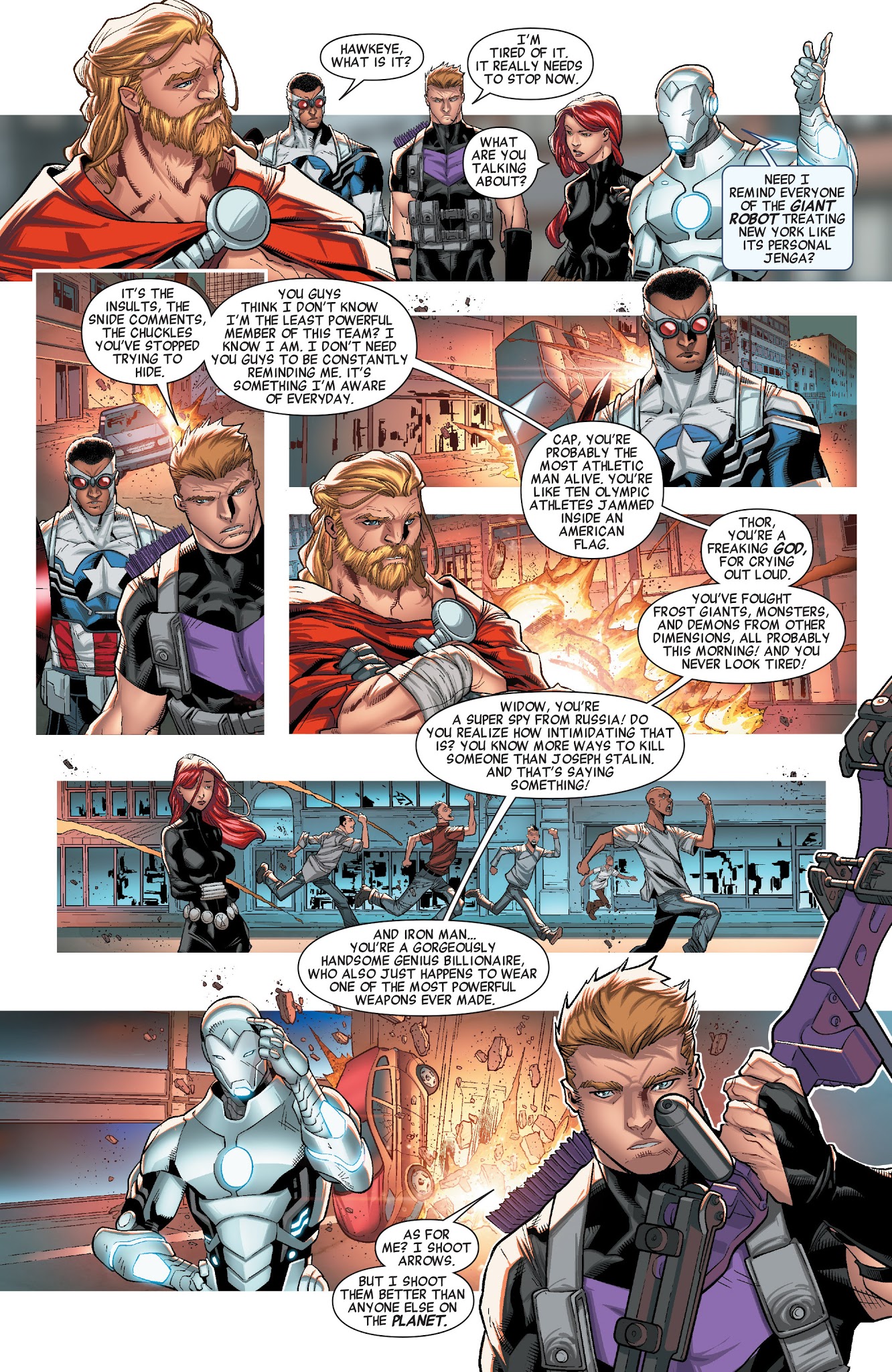 Tuy nhiên, chính vì tất cả thành viên Avengers đều biết nỗi khổ của Clint nên đôi khi họ đều tạo điều kiện giúp đỡ. Trong lần đánh với con robot khổng lồ đó, họ đã đổi kế hoạch và hỗ trợ hết mình để Clint có thể 1 phát bắn mà hạ gục con robot đó.