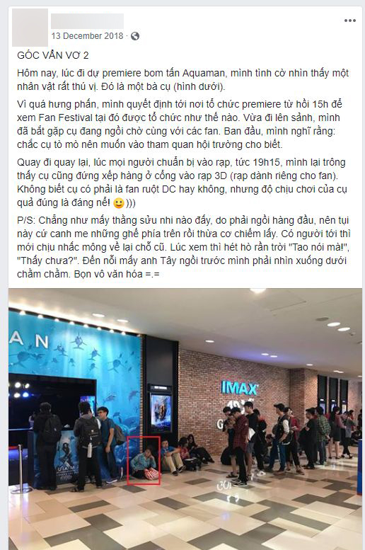 Hôm nay, lúc đi dự premiere bom tấn Aquaman, mình tình cờ nhìn thấy một nhân vật rất thú vị. Đó là một bà cụ (hình dưới).