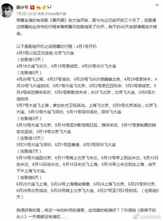 Ngày 2 tháng 7 vừa qua có cư dân mạng đăng tải “lịch trình của Dương Mịch” cho biết phim Bạo phong nhãn đã khai máy được ba tháng nhưng Dương Mịch chỉ ở trong đoàn phim có 52 ngày, còn lại 42 ngày kia toàn bộ đều xin nghỉ phép. Nên ngau đó phía Dương Mịch cũng đã lên tiếng phủ nhận.