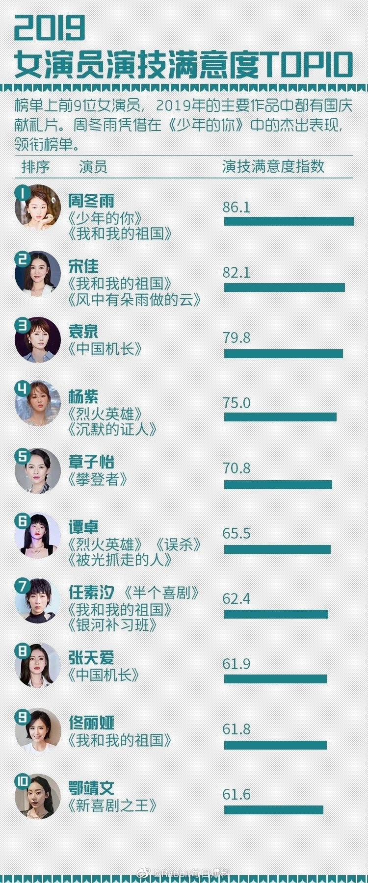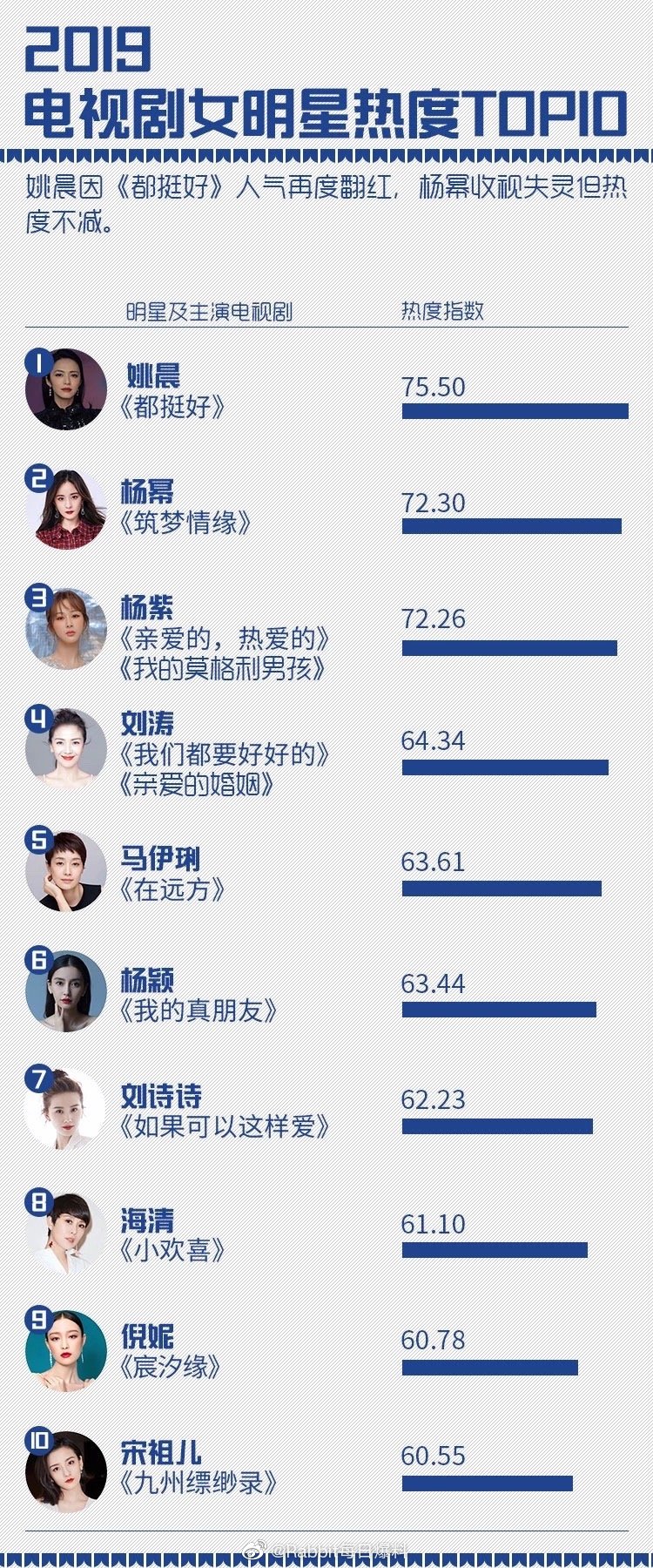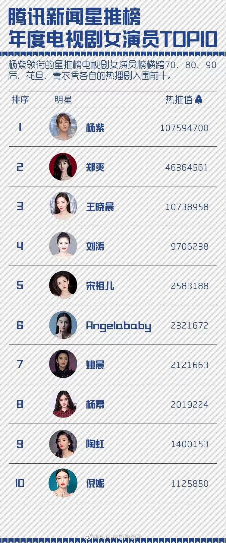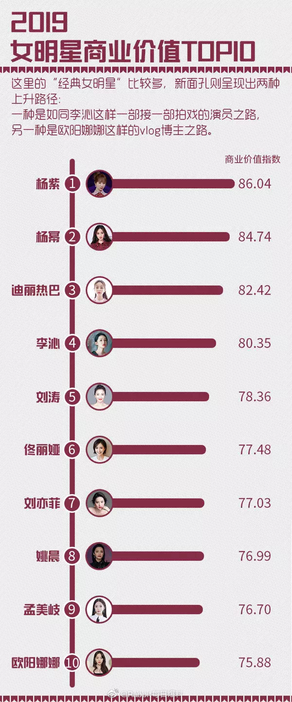Có thể nói, Dương Tử là một trong những nữ minh tinh thành công nhất trong năm 2019 vừa qua. Đặc biệt vào khoảng nửa năm sau (từ tháng 6 trở đi), nữ diên viên liên tiếp dẫn đầu danh sách nhiều bảng xếp hạng. Mới đây nhất, BXH Sách trắng Đằng Tấn được công bố, Dương Tử dẫn đầu hai hạng mục là Nữ diễn viên phim truyền hình của năm và Nữ minh tinh có giá trị thương mại nhất. Ngoài ra, hai bảng Nữ minh tinh có sức ảnh hưởng và Độ hài lòng về khả năng diễn xuất của nữ minh tinh, Dương Tử đều xếp trên top 5.