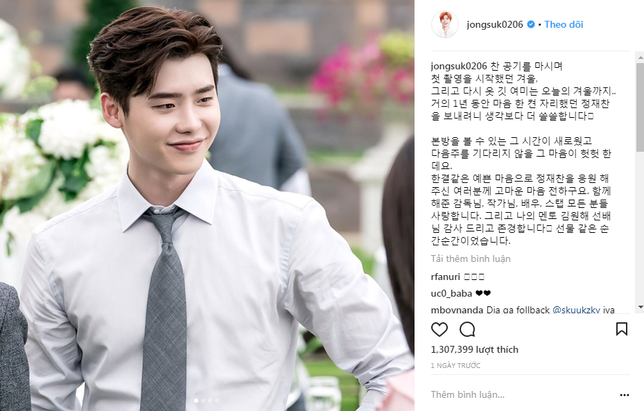 Trên trang instagram cá nhân của mình, nam diễn viên Lee Jong Suk - người thủ vai nam chính Jung Jae Chan cũng chia sẻ hình ảnh và dòng cảm xúc của bản thân sau tập cuối bộ phim: “Chúng tôi bắt đầu ghi hình khi trời vừa đổ lạnh, và giờ đây thời tiết đã chính thức bước sang đông… cố gắng rời bỏ Jung Jae Chan, người đi liền với tôi trong suốt một năm, quả là điều không mấy vui vẻ.