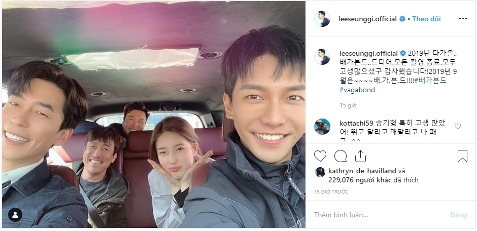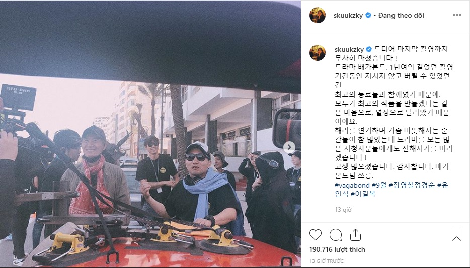 “Năm 2019 đã đến rồi.Vagabond. Quá trình quay phim đã hoàn thành rồi. Mọi người đã làm việc rất vất vả. Cảm ơn mọi người rất nhiều! Tháng 9 năm 2019 chính là ~~~ V.A.G.A.B.O.N.D!!!” - Lee Seung Gi chia sẻ.