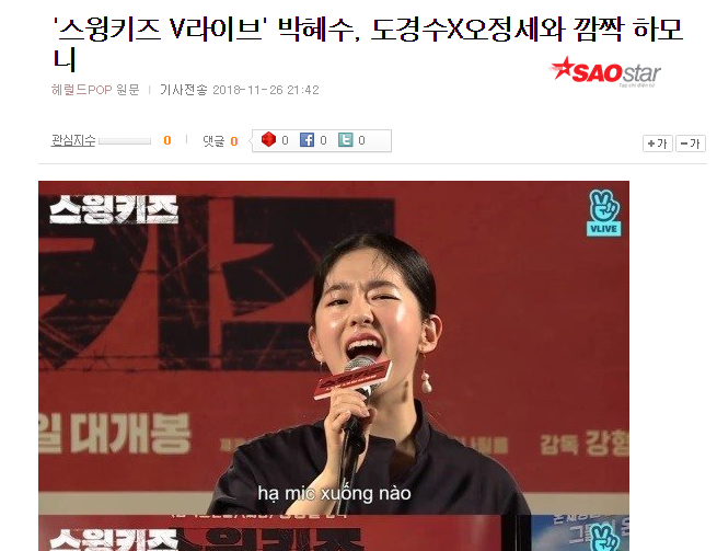 Vào ngày 26/11 vừa qua, đạo diễn và dàn diễn viên của dự án phim điện ảnh Swing Kids (스윙키즈) sắp tới gồm D.O. (EXO), Park Hye Soo và Oh Jung Se đã xuất hiện trên chương trình phát sóng để chia sẻ về sản phẩm mới của mình.