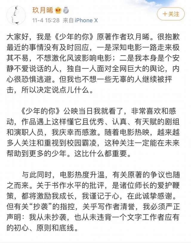 Hôm nay (04.11), tác giả nguyên tác Em của niên thiếu là Cửu Nguyệt Hi lần đầu tiên lên tiếng trả lời trên weibo về những tranh luận “đạo văn”. Cô phủ nhận chuyện sao chép những tác phẩm của tác giả khác: “Trong tác phẩm của tôi có lẽ cùng chung tư tưởng nhưng không hề đạo văn hay sao chép ai cả”.