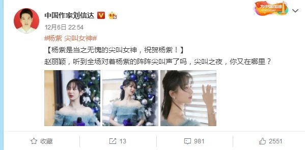 Ngay tại thời điểm Dương Tử nhận giải, Lưu Thư Đạt - một người tự xưng là nhà văn Trung Quốc với lượng follow khá lớn đăng bài mỉa mai nhân vật không liên quan đến sự việc chính là Triệu Lệ Dĩnh. “Nhà văn” này đã đăng bài bày tỏ: “Triệu Lệ Dĩnh có nghe được tiếng cổ vũ náo nhiệt đến chói tai của khán giả dành cho Dương Tử hay không? Cô có được mời tham dự Đêm hội gào thét?”.