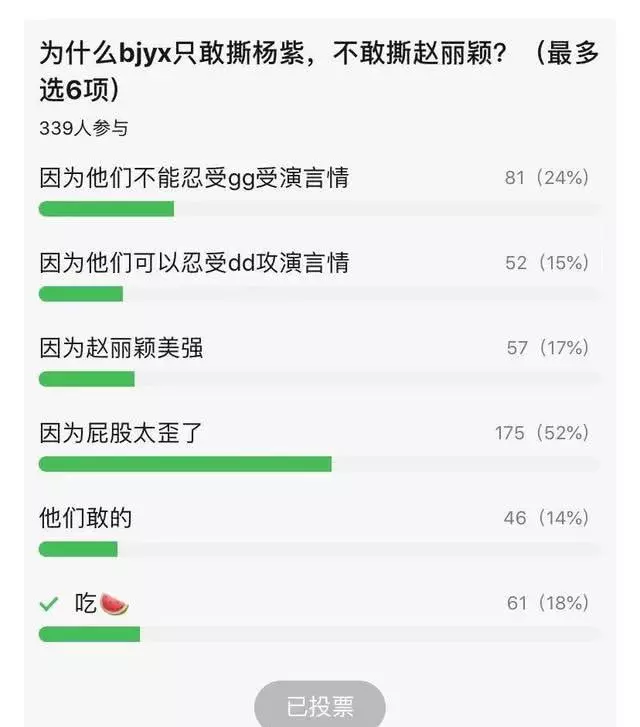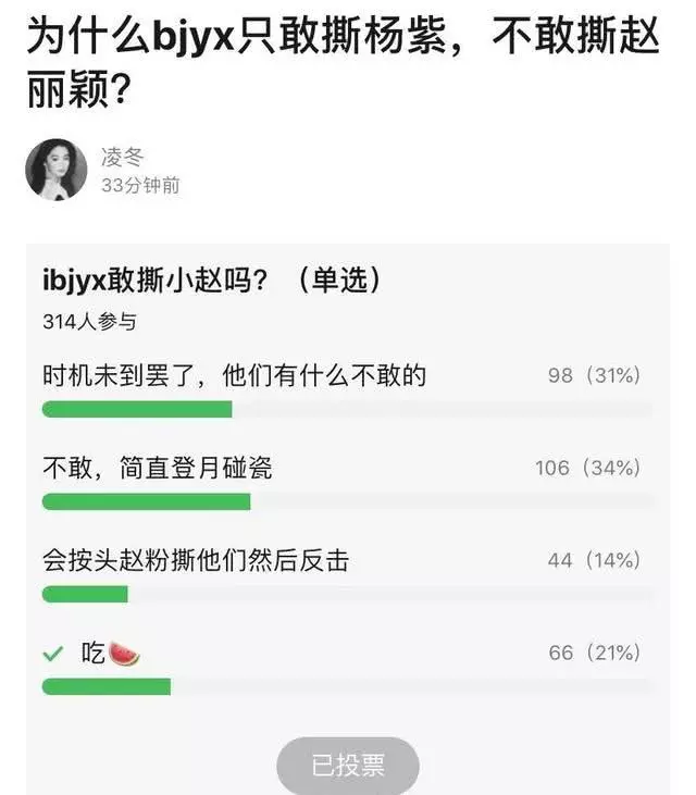 Ngày 11.02, cư dân mạng mở một cuộc điều tra trên diễn đàn: “Tại sao Bác Quân Nhất Tiêu chỉ dám chỉ trích Dương Tử mà lại buông tha cho Triệu Lệ Dĩnh?” Và câu trả lời “Thời cơ chưa đến, chỉ có vậy thôi, bọn họ có gì mà không dám” xếp vị trí thứ hai, vị trí thứ nhất là câu: “Không dám, thật sự khoảng cách giữa hai bên quá lớn“. Câu trả lời này cũng đã chứng minh fan hâm mộ Triệu Lệ Dĩnh lợi hại hơn so với fan Dương Tử rất nhiều.