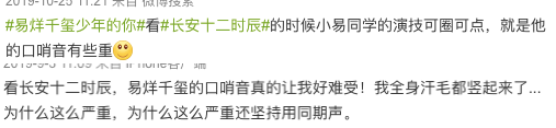 Mặc dù năm ngoái, Dịch Dương Thiên Tỉ được đánh giá rất cao về khả năng diễn xuất nhưng khả năng nhả thoại cũng vấp phải không ít sự chê bai: “Khẩu âm nghe hơi nặng”, “Nghe thật sự không thoải mái chút nào“… Dù sau này, khi phim Em của thời niên thiếu được cống chiếu, đài từ của Dịch Dương Thiên Tỉ đã chuyển biến không ít, nhưng khi đứng với Châu Đông Vũ, anh trở nên lép vế.