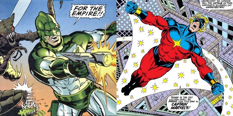 Mạch truyện về Captain Marvel tương đối rối rắm phức tạp thậm chí là đối với những fan “cứng” của nguyên tác truyện tranh. Ban đầu, một chiến binh người Kree mang tên Mar-Vell đã đến Trái Đất trong trang phục mang hai màu xanh lá và trắng. Đây cũng chính là vị Captain Marvel đời đầu. Sau đó, Mar-Vell đã “lên đời” bộ đồ của mình với tông màu đỏ-xanh biển điểm thêm ngôi sao vàng trước ngực và điều này có lẽ đã trở thành nguồn cảm hứng đối với Carol Danvers.