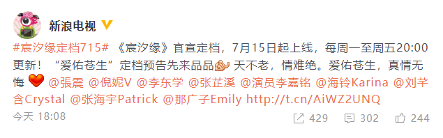 Vào ngày 11/7, trang Truyền hình Sina đã thông báo rằng phim chính thức định ngày phát sóng. Trước đó, theo Báo cáo hàng tháng của phim truyền hình vào tháng 6/2019, phim Tam sinh tam thế thần tịch duyên do Trương Chấn, Nghê Ni đóng chính sẽ đổi tên thành “Thần tịch duyên”. Dân mạng đã để lại nhiều lời bình tích cực như: “Trông chờ”, “Tạo hình cổ trang của Nghê Ni thật xinh đẹp”, “Nhạc nghe hay qua mọi người ơi”,…