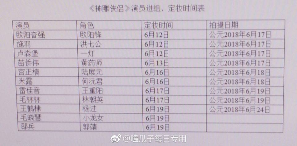 Tuy nhiên, phải đến gần đây hai cái tên được chọn mặt gửi vàng cho vai diễn Dương Quá và Tiểu Long Nữ mới chính thức được xác nhận. Dương Quá sẽ được giao vào tay nam diễn viên Vương Hạc Đệ, còn Cô Cô sẽ do Mao Hiểu Huệ thủ vai. Tin tức này còn gây sửng sốt hơn cả những hình ảnh về tạo hình Tiểu Long Nữ của Lý Khải Hinh trước đó.
