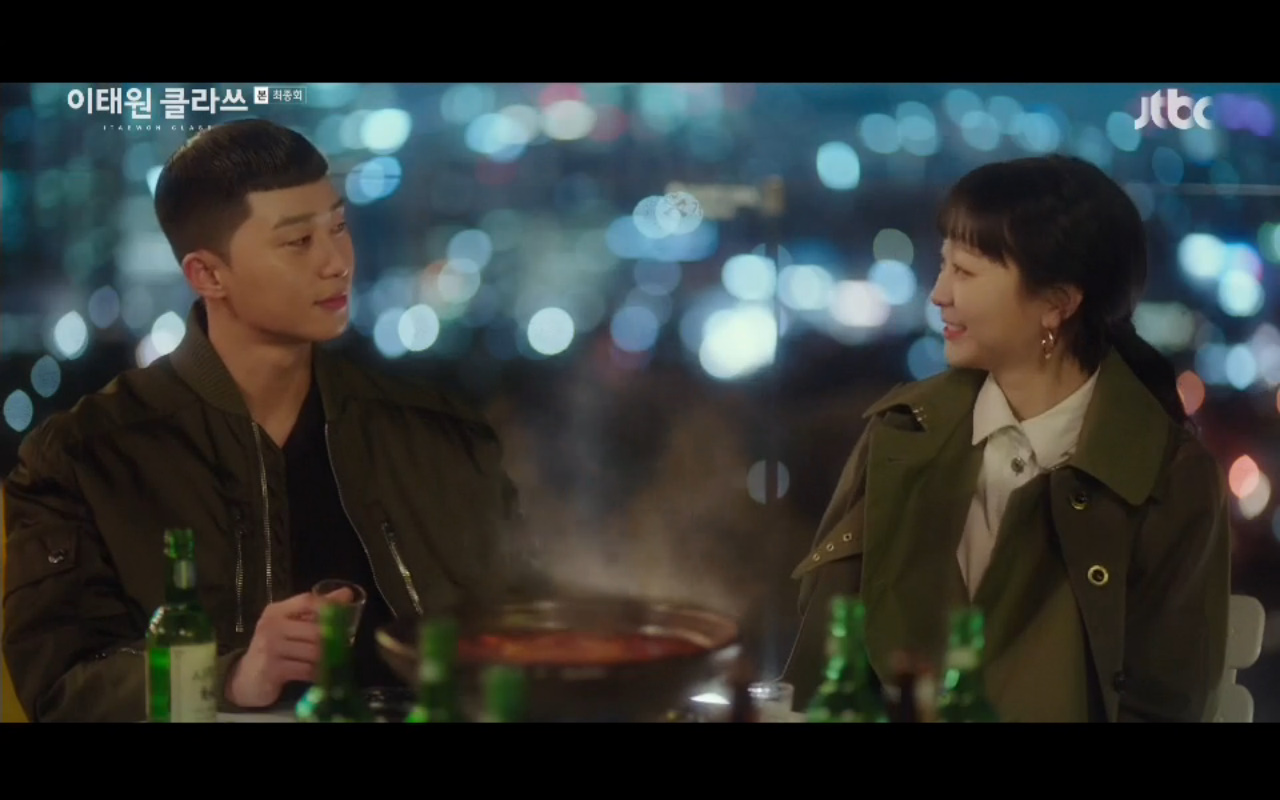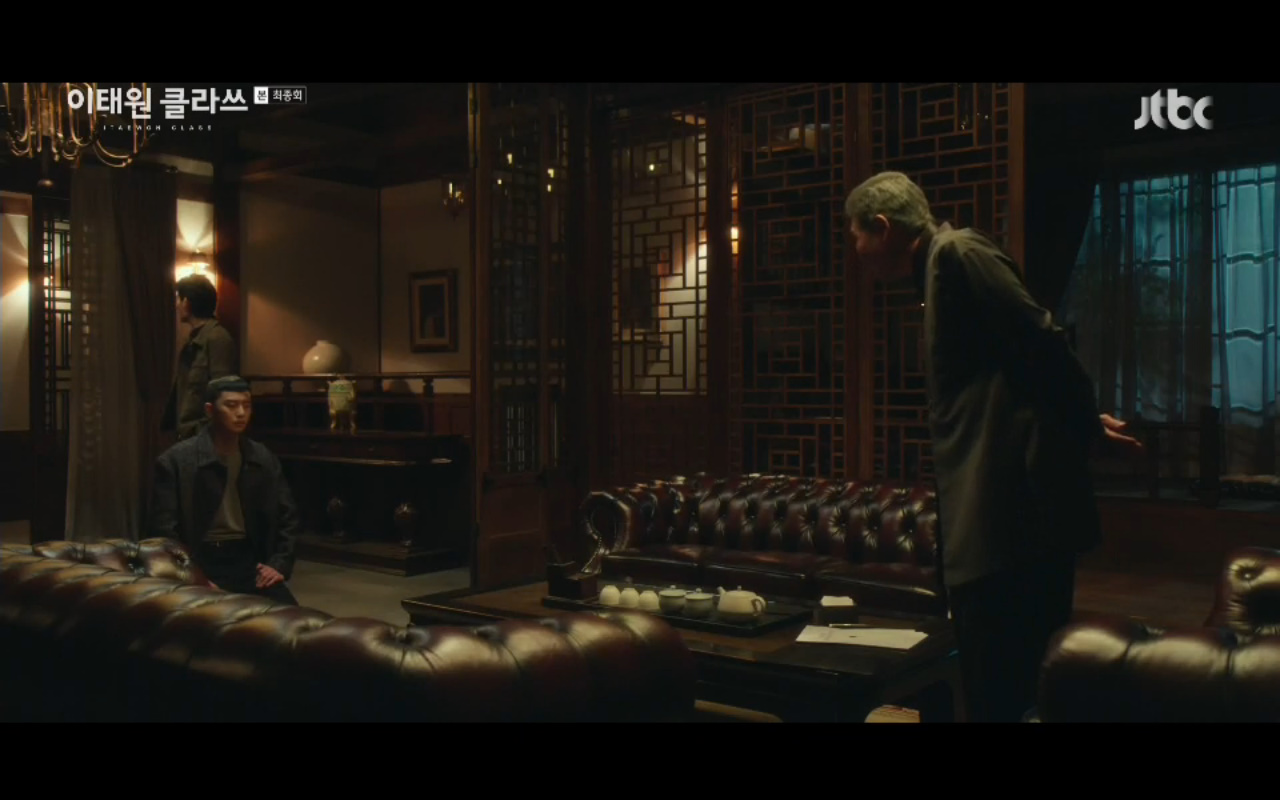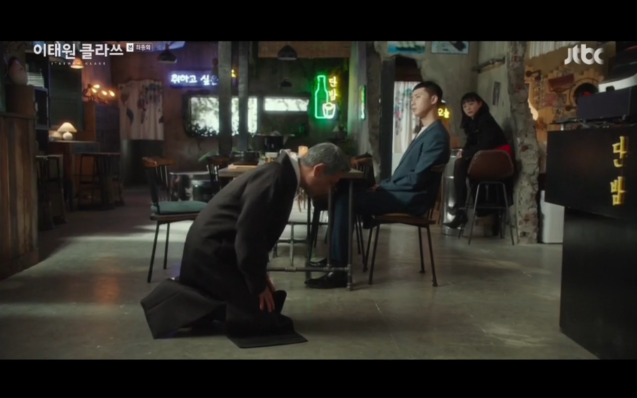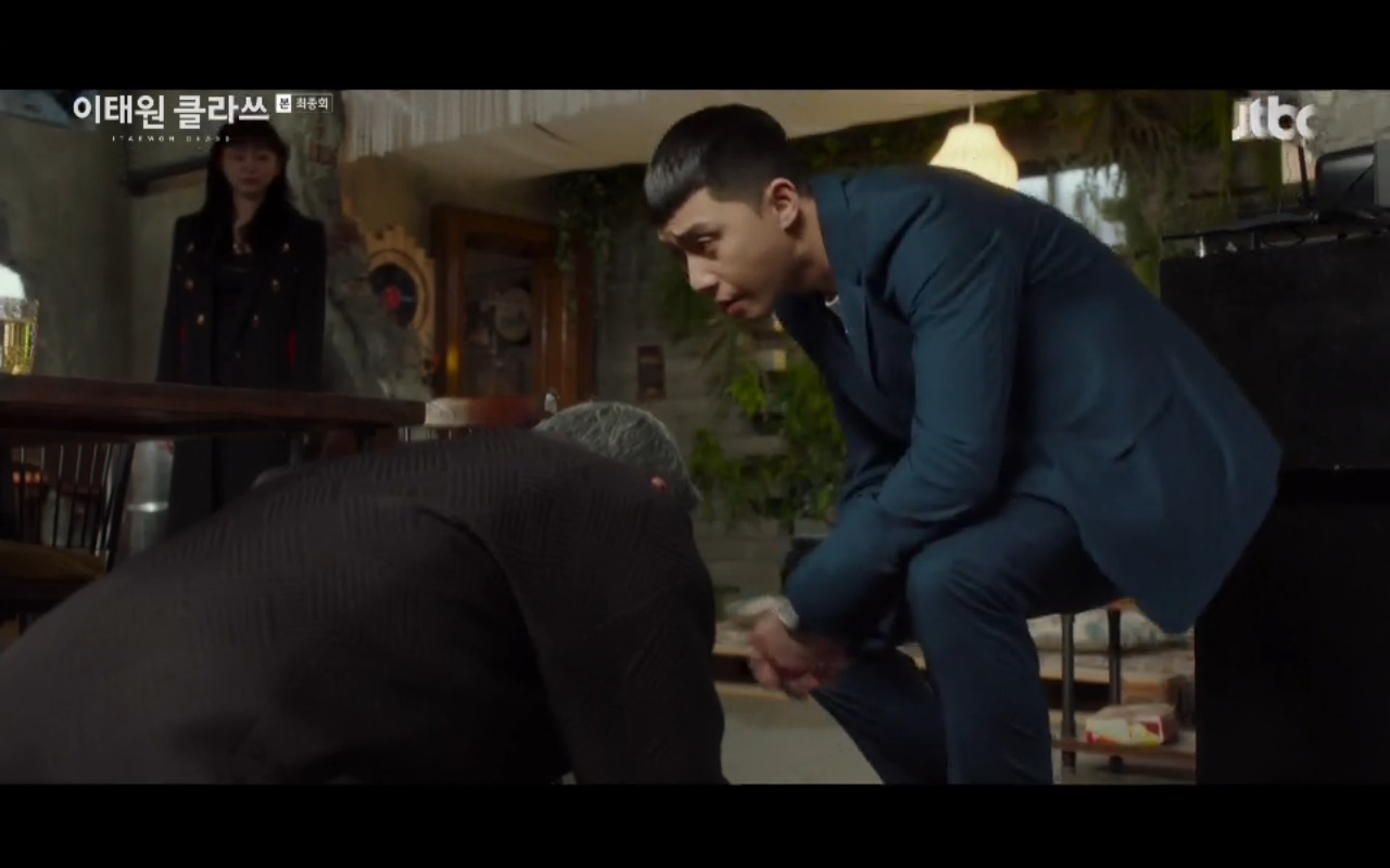Tiếp nối tập trước của Tầng lớp Itaewon là phân cảnh nhẫn nhục của Park Saeroyi (Park Seo Joon) quỳ gối xin kẻ thù Jang Dae Hee nói ra địa chỉ của con trai. Lần quỳ gối này không phải là việc Saeroyi chấp nhận thua ông mà là việc anh chọn anh buông bỏ trước để giải thoát trong vòng vây thù hằn. Đến cuối cùng khi nhìn thấy đối thủ của mình quỳ gối nhưng chủ tịch Jang vẫn không cảm thấy được niềm vinh quang chiến thắng.