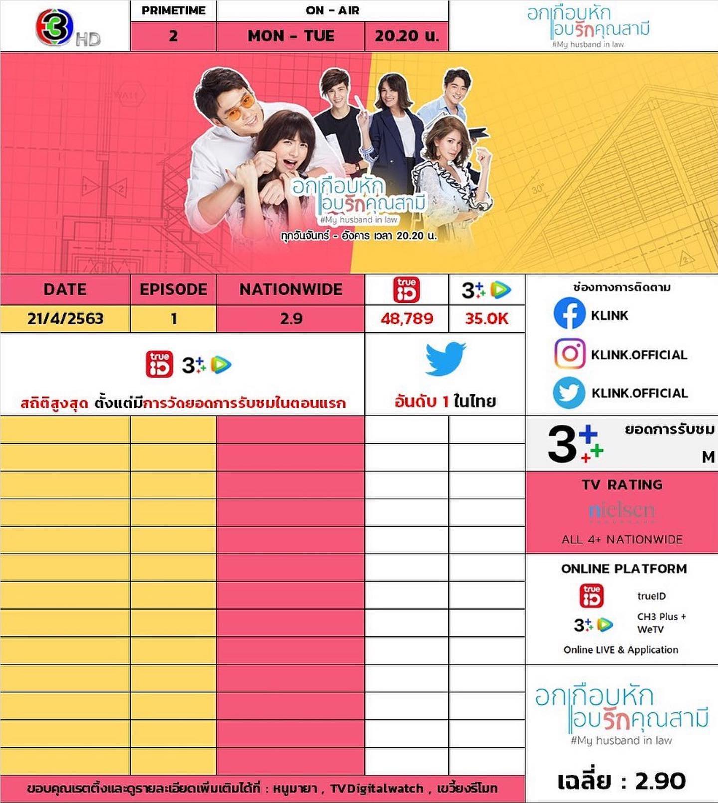 Khán giả đã chờ đợi một thời gian dài (khoảng 2 năm) kể từ khi phim bắt đầu triển khai cuối cùng bộ phim truyền hình thuộc big project của năm nay Ok Keub Hak Ab Ruk Khun Samee ( tựa anh: My Husband In Law) đã chính thức trình làng tập đầu tiên vào tối thứ 3 ( 21 tháng 4). Bộ phim được thực hiện bởi 2 người phụ nữ tài năng đã làm nên không ít bộ phim thành công cho đài 3 đạo diễn Aew Ampaipon dưới sự giám sát sản xuất của Anne Thongprasom từ công ty Thong Entertainment. Khoảng thời gian chờ đợi 2 năm cho sự kết hợp của bộ đôi diễn viên lần đầu đóng cặp cùng nhau Mark Prin và Mew Nittha đã được đền bù xứng đáng khi tập 1 lên sóng nhận được phản hồi khá tích cực từ phía khán giả xem truyền hình.