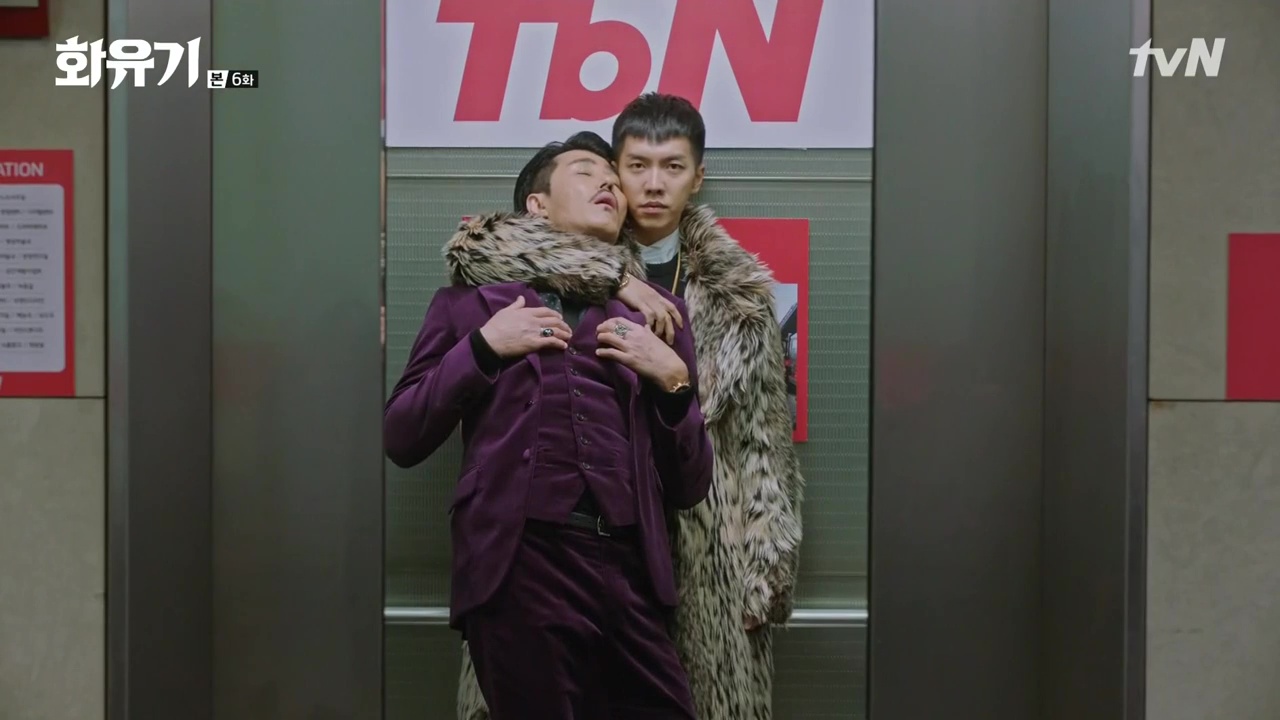 O Gong bất ngờ đánh ngất Ma Vương rồi lôi vào thang máy.