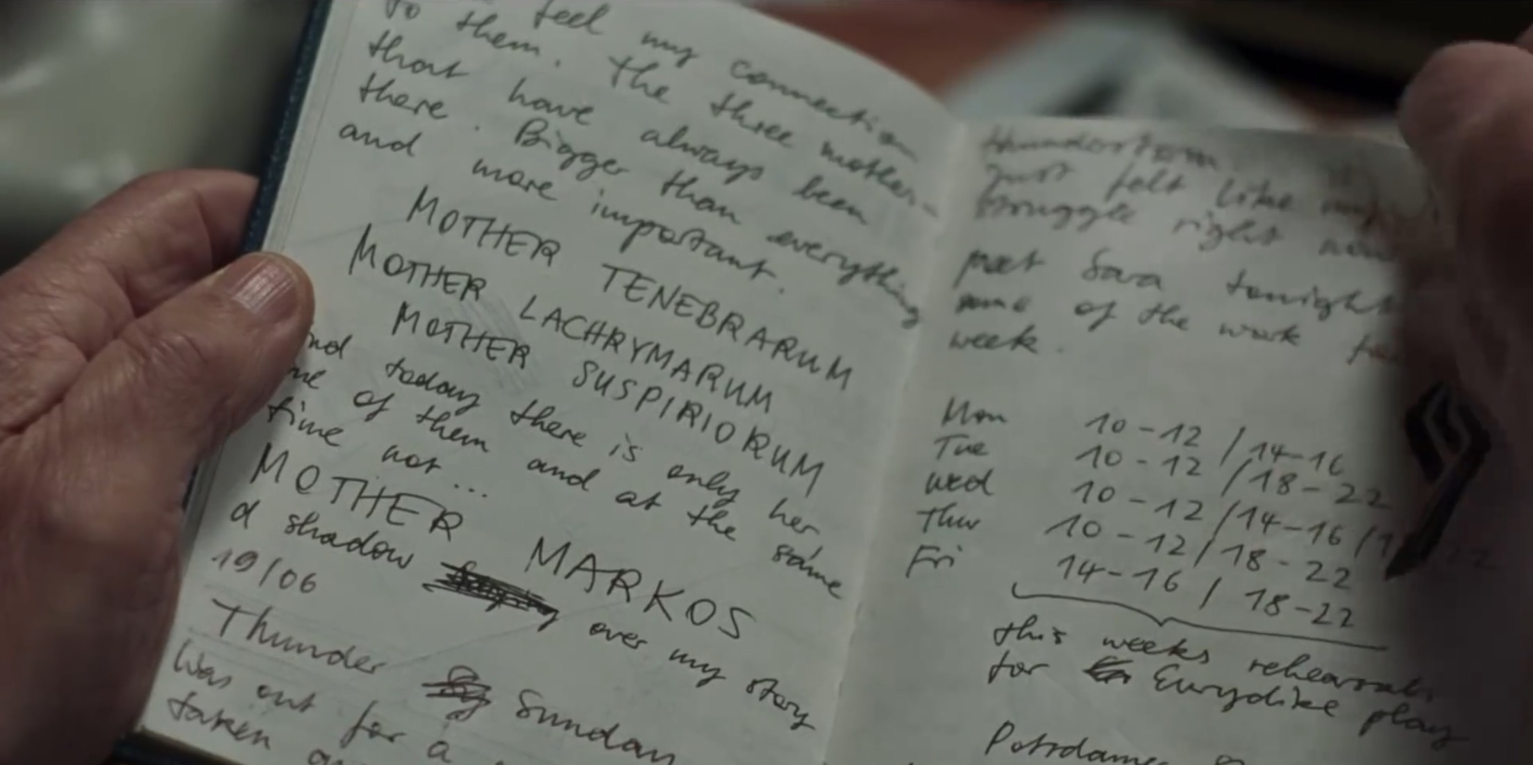 The Three Mothers được ghi chú trong sổ tay, cũng là tên của bộ ba tác phẩm kinh dị nổi tiếng nhất của Dario Argento.