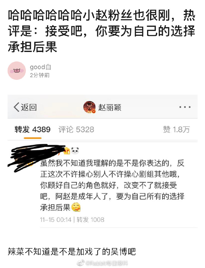 “Mặc dù tôi không biết điều mà tôi hiểu có giống với những gì mà chị muốn biểu đạt không, dù sao thì lần này không cần phải nhọc lòng vì người khác, không cần nhọc lòng vì đoàn phim hay những thứ khác. Chị nên để tâm đến nhân vật của mình cho thật tốt, không thay đổi được thì chấp nhận đi. A Triệu là người trưởng thành rồi, nên vì lựa chọn của mình mà gánh chịu hậu quả“. Ý kiến này đến từ một fan hâm mộ của Triệu Lệ Dĩnh và trở thành bình luận nhận được rất nhiều sự tán thành của những fan khác với hơn hàng ngàn lượt like.