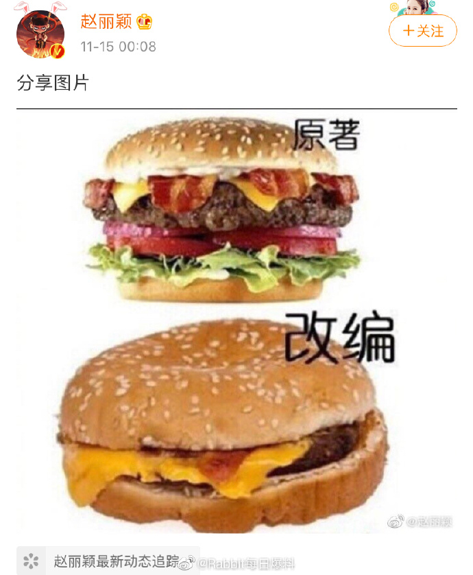 Mới đây vào nửa đêm (14.11), Triệu Lệ Dĩnh đăng bài viết chia sẻ hình ảnh ám chỉ về việc không hài lòng với kịch bản chuyển thể Hữu phỉ. Cô đăng bức ảnh về hai chiếc hamburger, một cái đầy đủ với nguyên liệu phong phú bắt mắt được chú thích là nguyên tác, một cái với nguyên liệu sơ sài, mất đi “tinh hoa” được minh hoạ là cải biên.