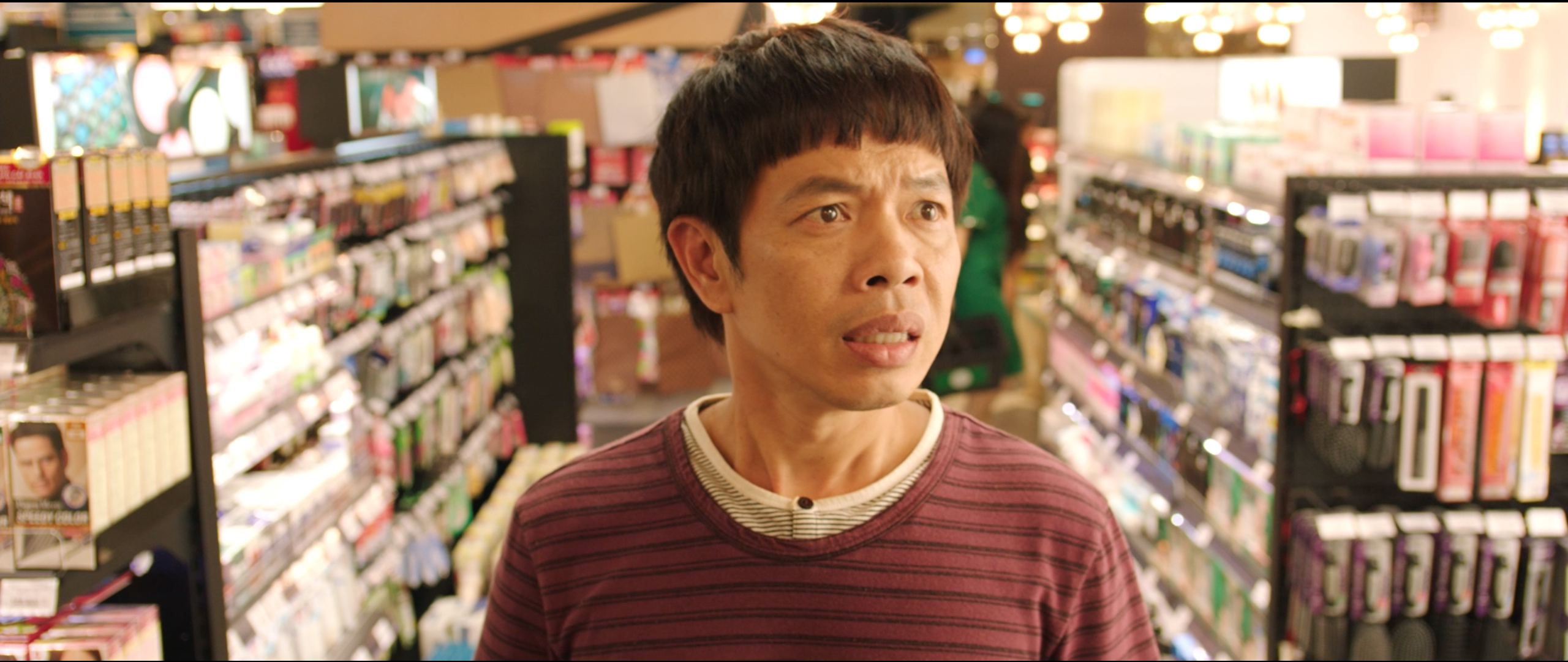 Trái ngược với vẻ thành đạt, cao sang của Mai thì Hùng (Thái Hòa) - nam chính của bộ phim lại xuất hiện cuối trailer với hình ảnh giản dị và hài hước trong một hoàn cảnh khá đặc biệt. Đứng trước gian hàng phụ nữ, Hùng như cảm thấy lạc vào mê cung và liên tục thắc mắc về tên gọi cũng như công dụng của các sản phẩm mà chắc cả đời anh chẳng một lần cần đến.