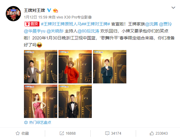 Chương trình Vương bài đối vương bài mùa 5 (王牌对王牌5) đã chính thức quay hình, cả hội lúc trước đều quay về. Tin chắc đây sẽ là tin vui với nhiều khán giả yêu thích chương trình này vì các MC của chương trình đều là người hài hước. Ví dụ như “chú” Thẩm Đằng, mỗi lần xuất hiện đều mang đến không ít sức sống vui tươi cho mọi người. Sự trở lại của Quan Hiểu Đồng và Hoa Thần Vũ càng làm cho không ít khán giả cảm thấy phấn khích. Gần đây, chương trình đã bắt đầu mở máy quay hình và trên mạng bắt đầu lan truyền nhiều hình ảnh phía sau hậu trường.