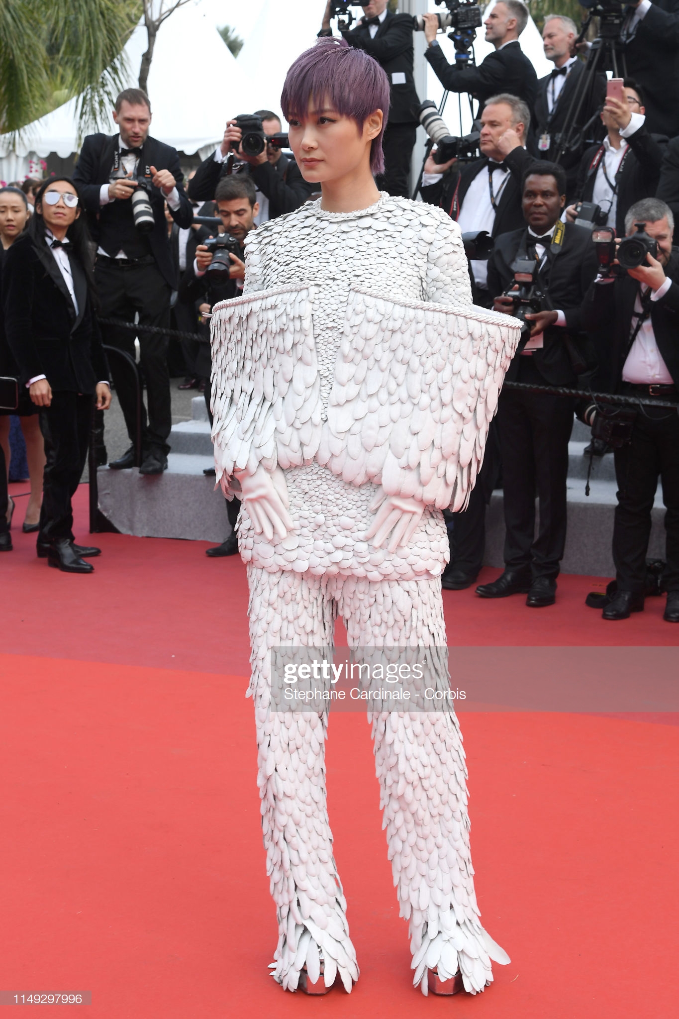 Bộ trang phục lỗng vũ màu trắng độc đáo, vô cùng lạ mắt và có chút cứng đơ.