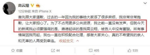 Cứ tưởng Đổng Tuyền sẽ cùng Cao Vân Tường đồng cam cộng khổ thì bất ngờ hai tháng ngay sau khi Đường Đức khởi kiện thì đôi vợ chồng minh tinh lại tuyên bố ly hôn. Toàn bộ tài sản sẽ được chuyển sang cho Đổng Tuyền nắm giữ. Trước đó, Cao Vân Tường vì vợ mà lên Weibo làm rõ Đường Đức chỉ khởi kiện một mình anh, không dính dáng, liên can gì đến Đổng Tuyền.