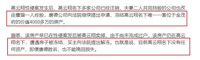 Vì cứu vãn tổn thất vào giữa tháng 1 năm nay, Đường Đức ảnh thị đã nộp đơn lên tòa án, yêu cầu đóng băng toàn bộ tài sản của Cao Vân Tường và Đổng Tuyền để đền bù thiệt hại cho dự án. Tổng tài sản của hai vợ chồng trị giá hơn 63 triệu NDT (217 tỷ đồng) bị phong tỏa hoàn toàn.